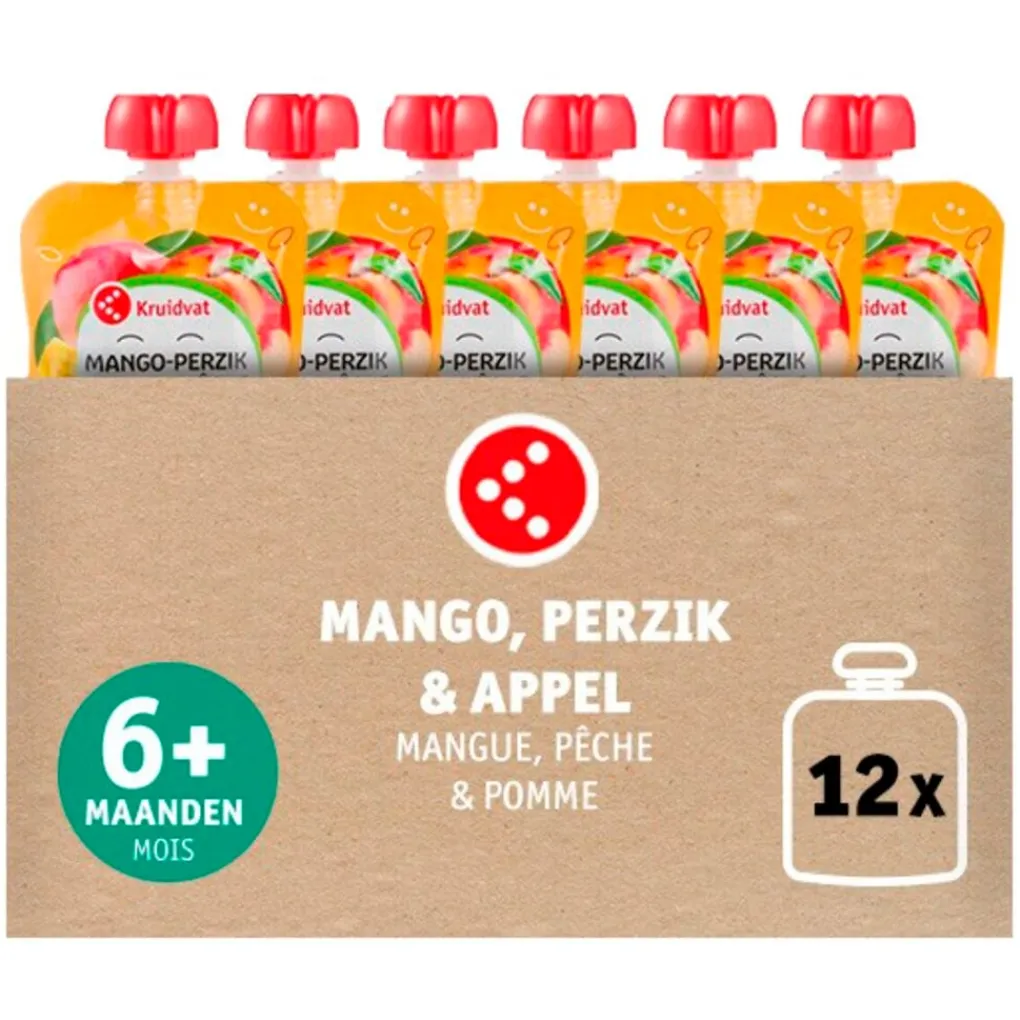 Het Kruidvat 6+M Bio Mango-Perzik met Appel Knijpzakje bevat gepasteuriseerde fruitpurree voor zuigelingen vanaf 6 maanden. Het knijpfruit bevat geen toegevoegde suikers, maar alleen suikers die van nature aanwezig zijn in fruit.