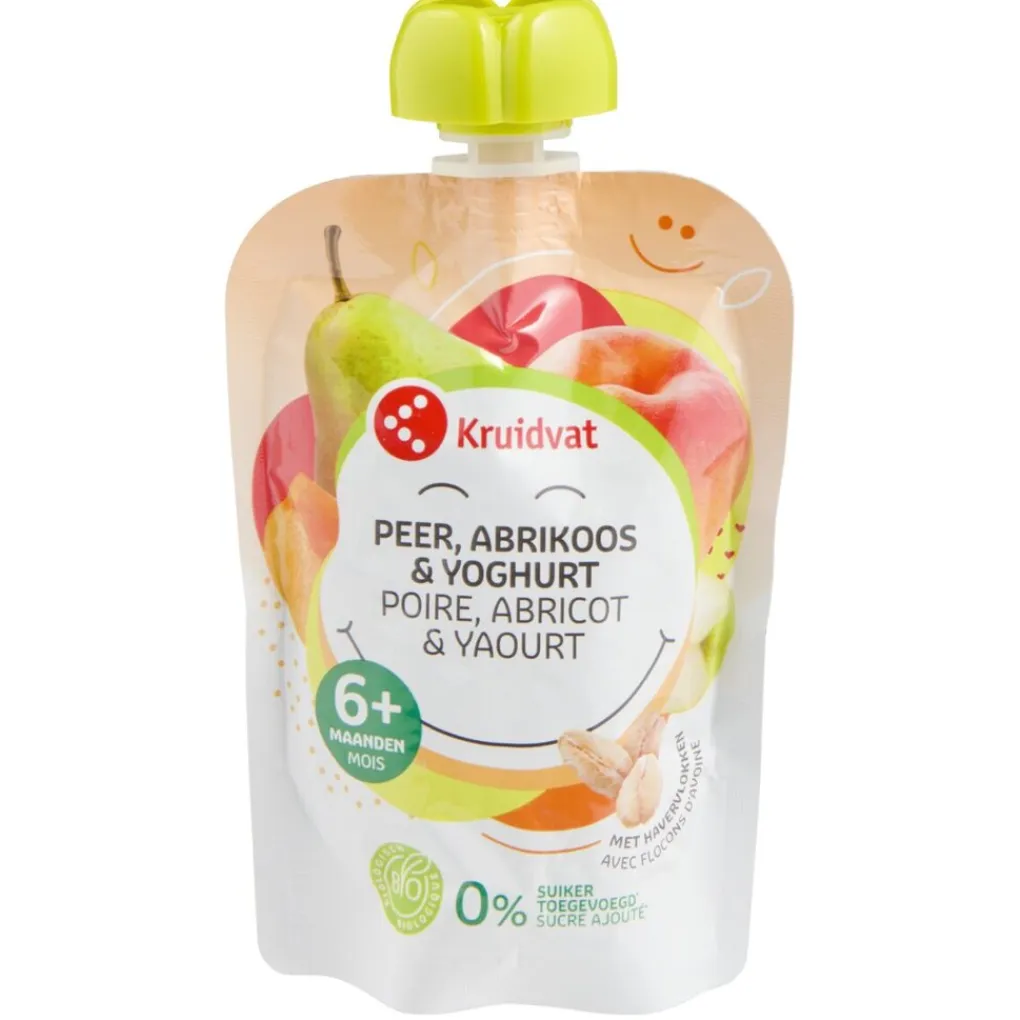 Kruidvat 6+M Bio Yoghurt Abrikoos Peer Haver Knijpfruit is een gezonde snack voor tussendoor. Je kleintje leert zo snel nieuwe smaken kennen.