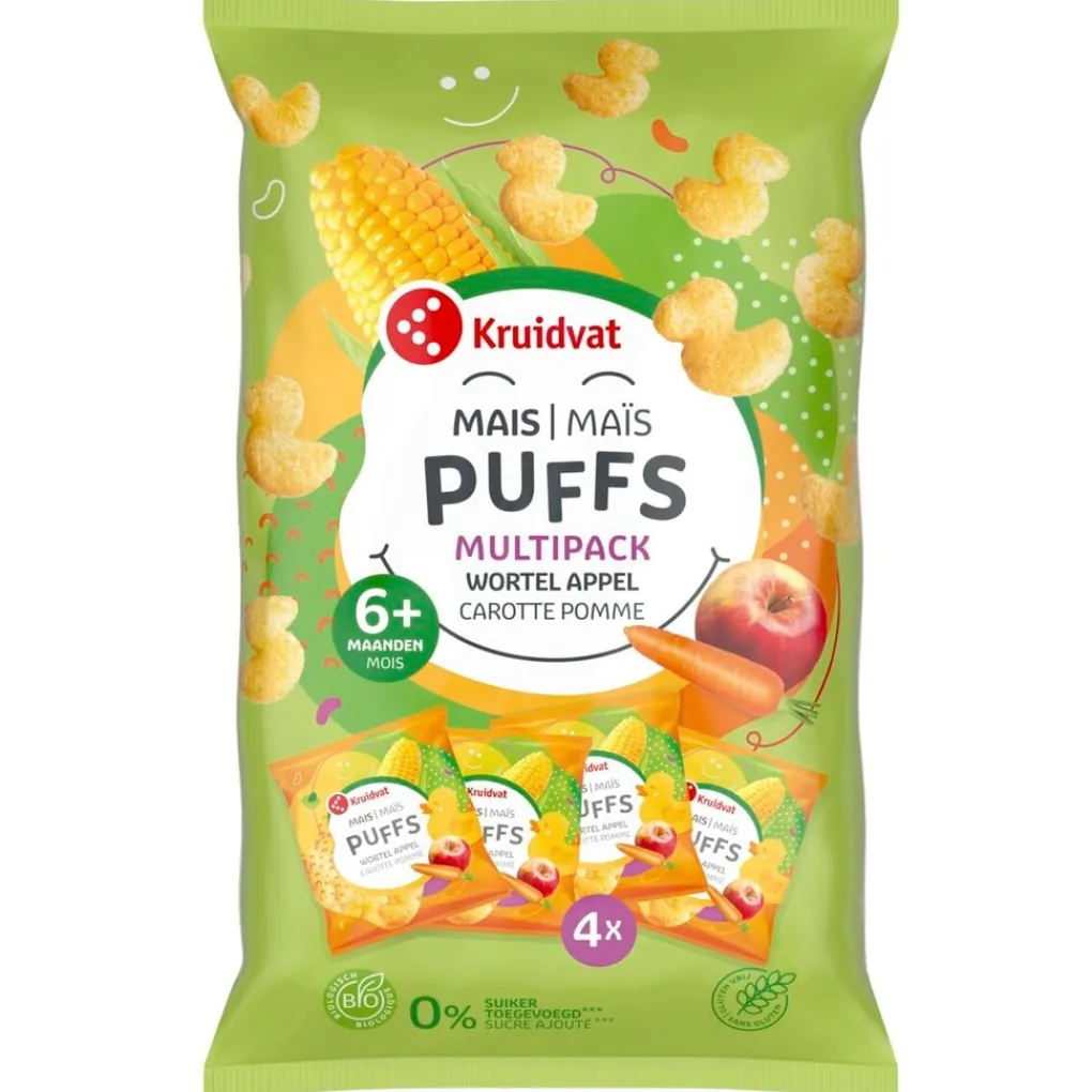 Met de Kruidvat 7+M Bio Appel en Wortel Maïspuffs krijg je in portie verpakte gepofte maisknabbels. Ze zijn precies groot genoeg zodat je kindje ze zelf oppakt en opeet. Ze smelten in de mond.