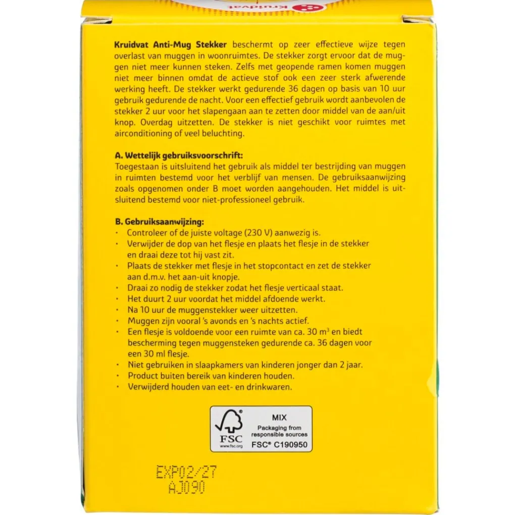 A. Wettelijk gebruiksvoorschrift: Toegestaan is uitsluitend het gebruik als middel ter bestrijding van muggen in ruimten bestemd voor het verblijf van mensen. De gebruiksaanwijzing zoals opgenomen onder B moet worden aangehouden. Het middel is uit-sluitend bestemd voor niet-professioneel gebruik. B. Gebruiksaanwijzing: Controleer of de juiste voltage (230 V) aanwezig is. Verwijder de dop van het flesje en plaats het flesje in de stekker en draai deze tot hij vast zit. Plaats de stekker met flesje in het stopcontact en zet de stekker aan d.m.v. het aan-uit knopje. Draai zo nodig de stekker zodat het flesje verticaal staat. Het duurt 2 uur voordat het middel afdoende werkt. Na 10 uur de muggenstekker weer uitzetten. Muggen zijn vooral ’s avonds en ’s nachts actief. Een flesje is voldoende voor een ruimte van ca. 30 m³ en biedt bescherming tegen muggensteken gedurende ca. 36 dagen voor een 30 ml flesje. Niet gebruiken in slaapkamers van kinderen jonger dan 2 jaar.
