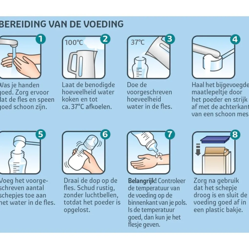 8. Zorg na gebruik dat het schepje droog is en sluit de voeding goed af in een plastic bakje.