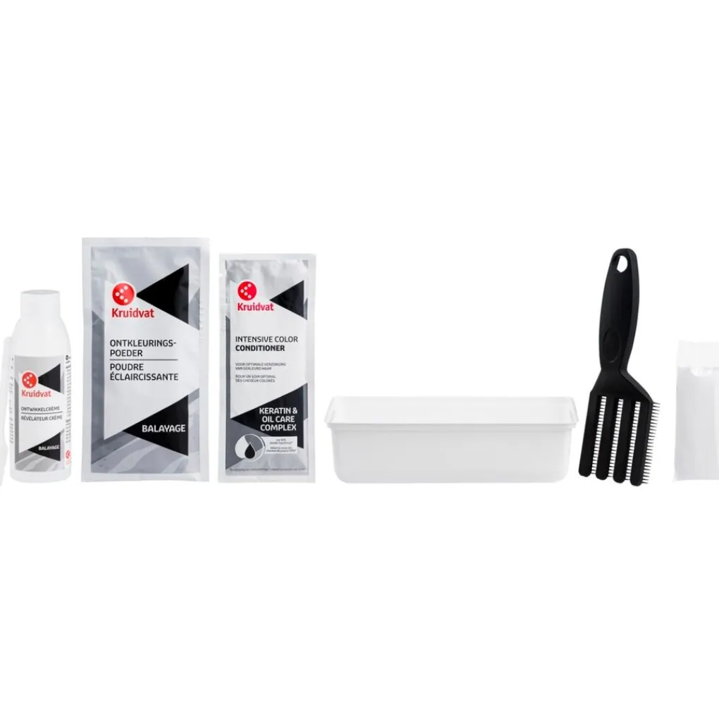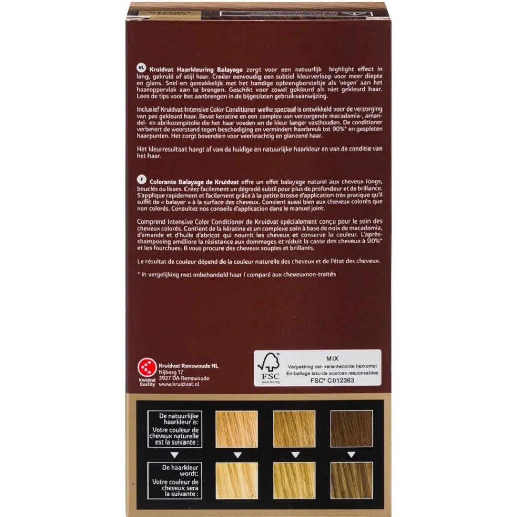Bij de Balayage haarverf krijg je Kruidvat Intensive Color Conditioner. Deze is speciaal ontwikkeld voor de verzorging van pas gekleurd haar. De conditioner bevat keratine en een complex van verzorgende macadamia-, amandel- en abrikozenpitolie die je haar voeden en de kleur langer vasthouden.