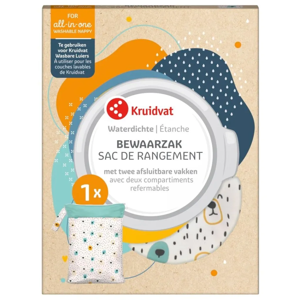 Deze schattige Kruidvat Bewaarzak voor Wasbare luiers met Berenprint is ontwikkeld voor het bewaren van schone en gebruikte wasbare luiers. Dankzij de twee aparte waterdichte vakken houd je deze eenvoudig gescheiden.
