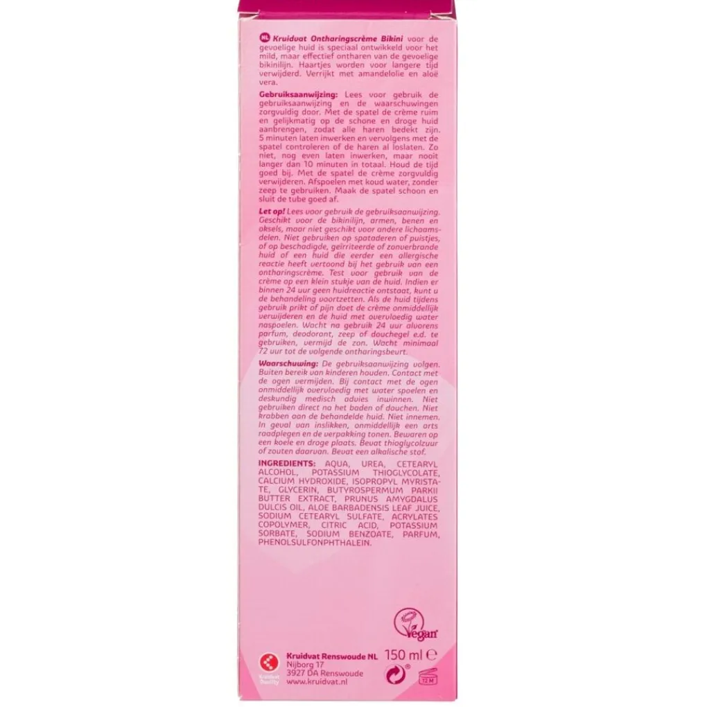 Let op! Lees voor gebruik de gebruiksaanwijzing. Deze ontharingscrème is geschikt voor je bikinilijn, armen, benen en oksels, maar niet geschikt voor andere lichaamsdelen. Niet gebruiken op spataderen of puistjes, of op beschadigde, geïrriteerde of zonverbrande huid of een huid die eerder een allergische reactie heeft vertoond bij het gebruik van een ontharingscrème.