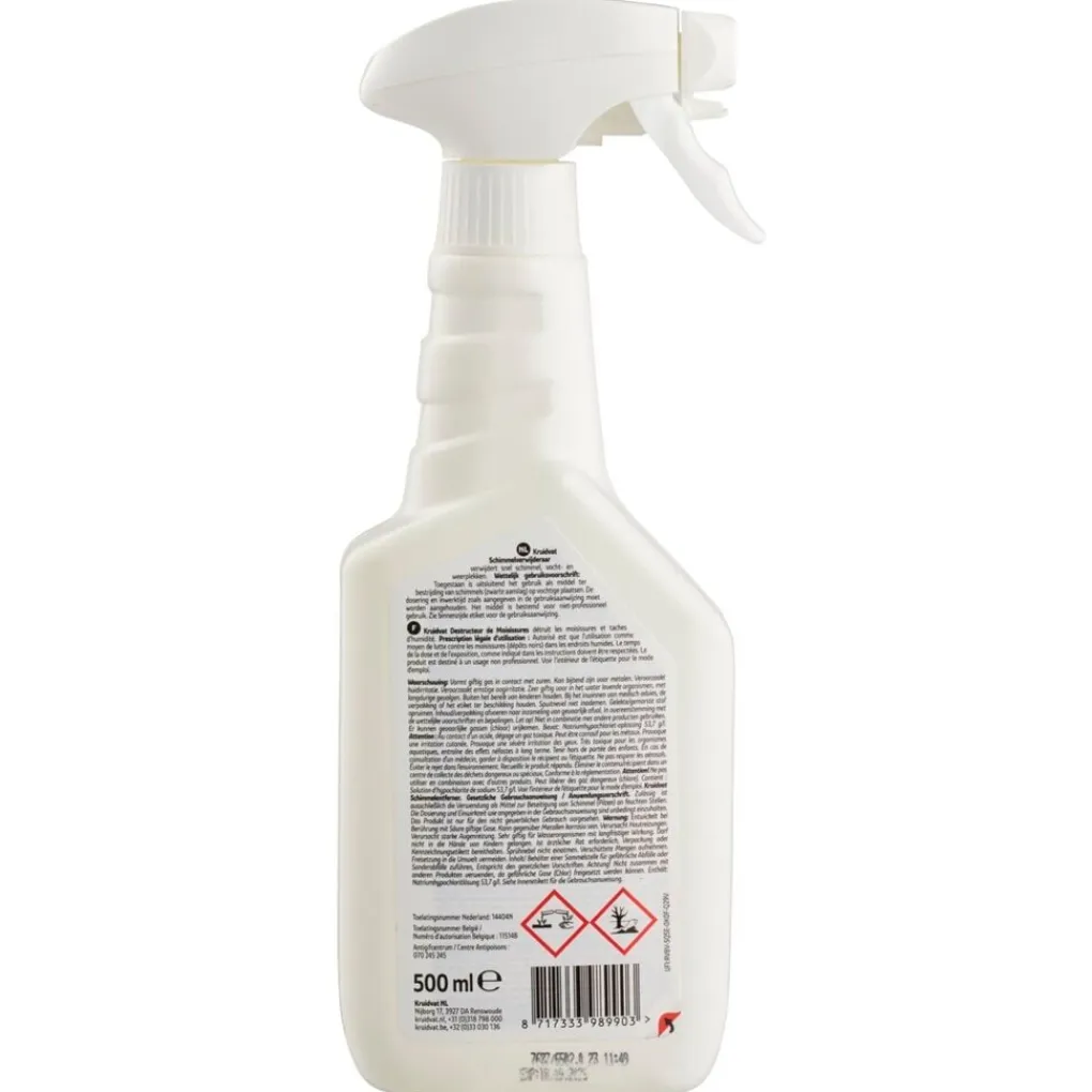Voor het desinfecteren van (tegel)wanden, voegen en plafonds in badkamer, douche, toilet, keuken, kelder, souterrain, sauna, zwembad, garage, schuur. Het middel bleekt grijs en zwart beschimmelde plaatsen. Vooraf een klein onopvallend deel op kleurechtheid en bestendigheid testen. Gebruik altijd handschoenen en werkkleding vanwege de bleekwerking, pas op spatten op niet-chloor bestendige oppervlakken, direct afnemen met water. Zorg voor voldoende ventilatie. Spuitnevel niet inademen. Schimmels voor het aanbrengen niet verwijderen. Zet het spuitnippeltje in de sproeistand, oppervlak vanaf circa 3-5 centimeter afstand besproeien en 10 minuten laten inwerken. Bij sterke vervuiling na 10 minuten de behandeling herhalen. Elastische voegen (b.v. Siliconenkit) bij voorkeur tweemaal behandelen. Bij lichte elastische voegen kan soms na gebruik enige bruine verkleuring blijven bestaan. Na gebruik het spuitnippeltje in de niet sproeistand terug zetten. Het besproeide oppervlak na afloop grondig reinigen met spons en water. Textiel en vloerbedekking (bleekvlekken), (blanke) metalen, glanzend verfwerk (mattering), tegels met een kwetsbare of beschadigde glazuurlaag (kleurverandering mogelijk). Deze oppervlakken eventueel voor de veiligheid bij gebruik afdekken. Bij contact met deze oppervlakken direct met water afspoelen. Niet gebruiken in combinatie met zuren en andere producten.