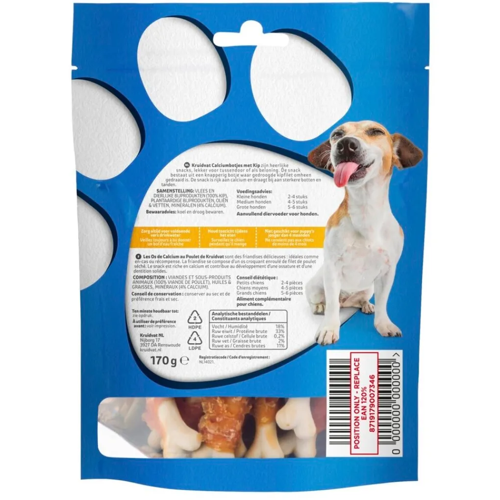 Laat je hond genieten van een heerlijke aanvullende snack met Kruidvat Calciumbotje Kip Hondensnacks.