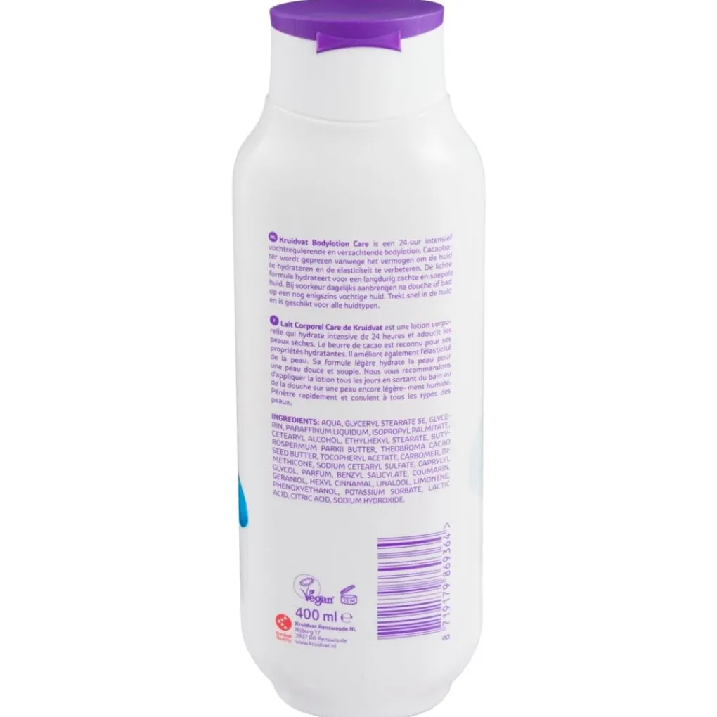 Kruidvat Care Cacao Butter Bodylotion is een intensief vochtregulerende en verzachtende bodylotion. De lotion is geschikt voor alle huidtypen.