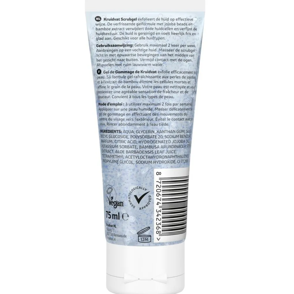 Gebruik maximaal 2 keer per week. Aanbrengen op een vochtige huid. Masseer de scrubgel licht in met opwaartse bewegingen van het midden van het gezicht naar buiten. Afspoelen met ruim lauwwarm water.
