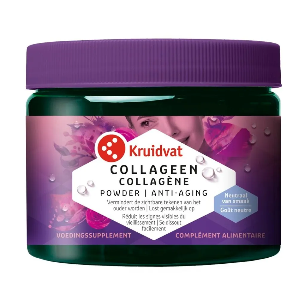 Vermindert de zichtbare tekenen van het ouder worden. Kruidvat Collageen Poeder bevat collageenpeptiden. Collageen is een eiwit dat helpt de elasticiteit van de huid te behouden.