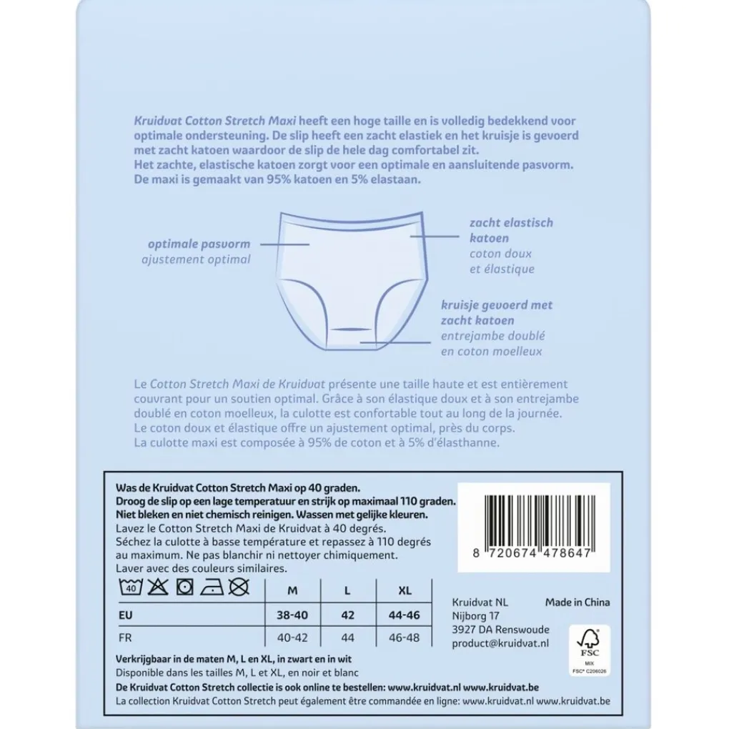 De Kruidvat Cotton Stretch Maxi Damesslip heeft een hoge taille en is volledig bedekkend voor optimale ondersteuning. De slip heeft een zacht elastiek.