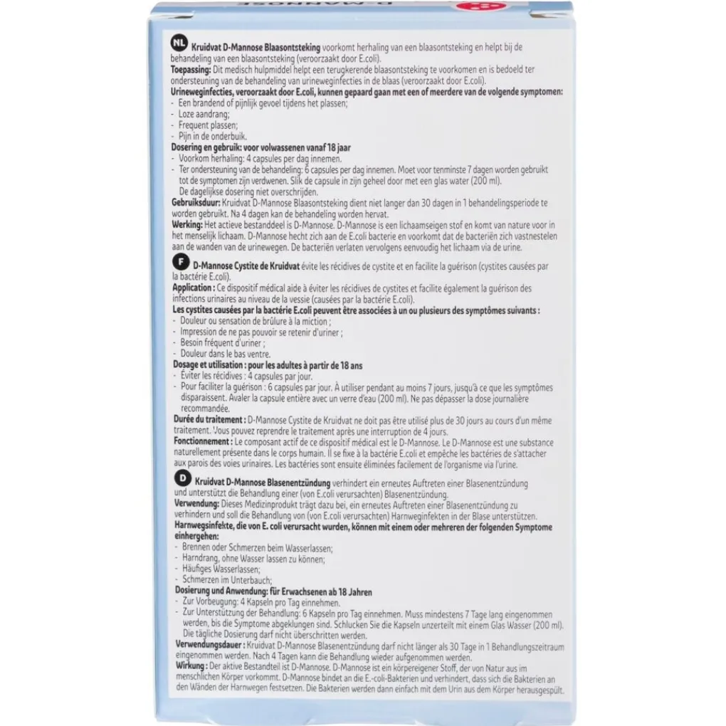 D-mannose Blaasontsteking dient niet langer dan 30 dagen in 1 behandelingsperiode te worden gebruikt. Na 4 dagen kan de