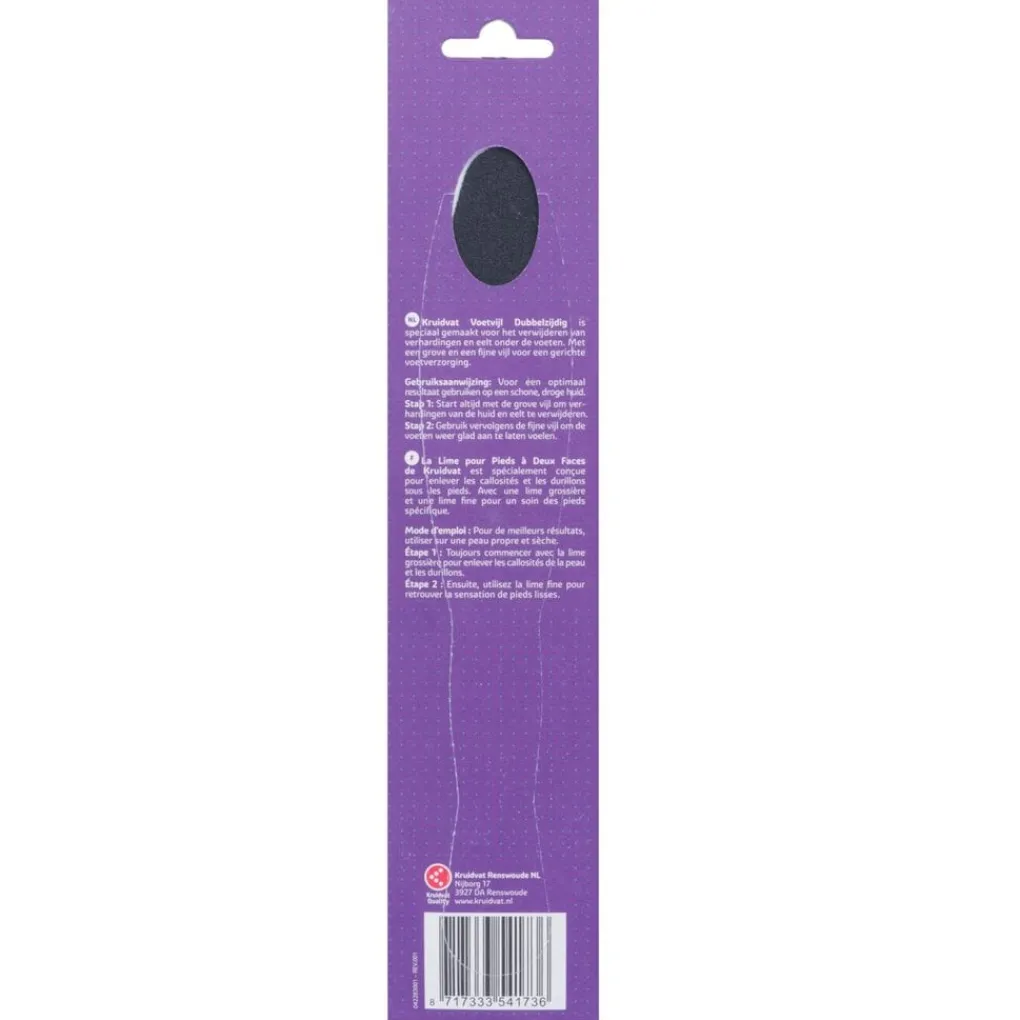 Verwijder verhardingen en eelt op je voeten met de Kruidvat Dubbelzijdige Voetvijl. De vijl heeft een grove en een fijne kant, waardoor je je voeten gericht verzorgt. Start altijd met de grove vijl en gebruik daarna de fijne.