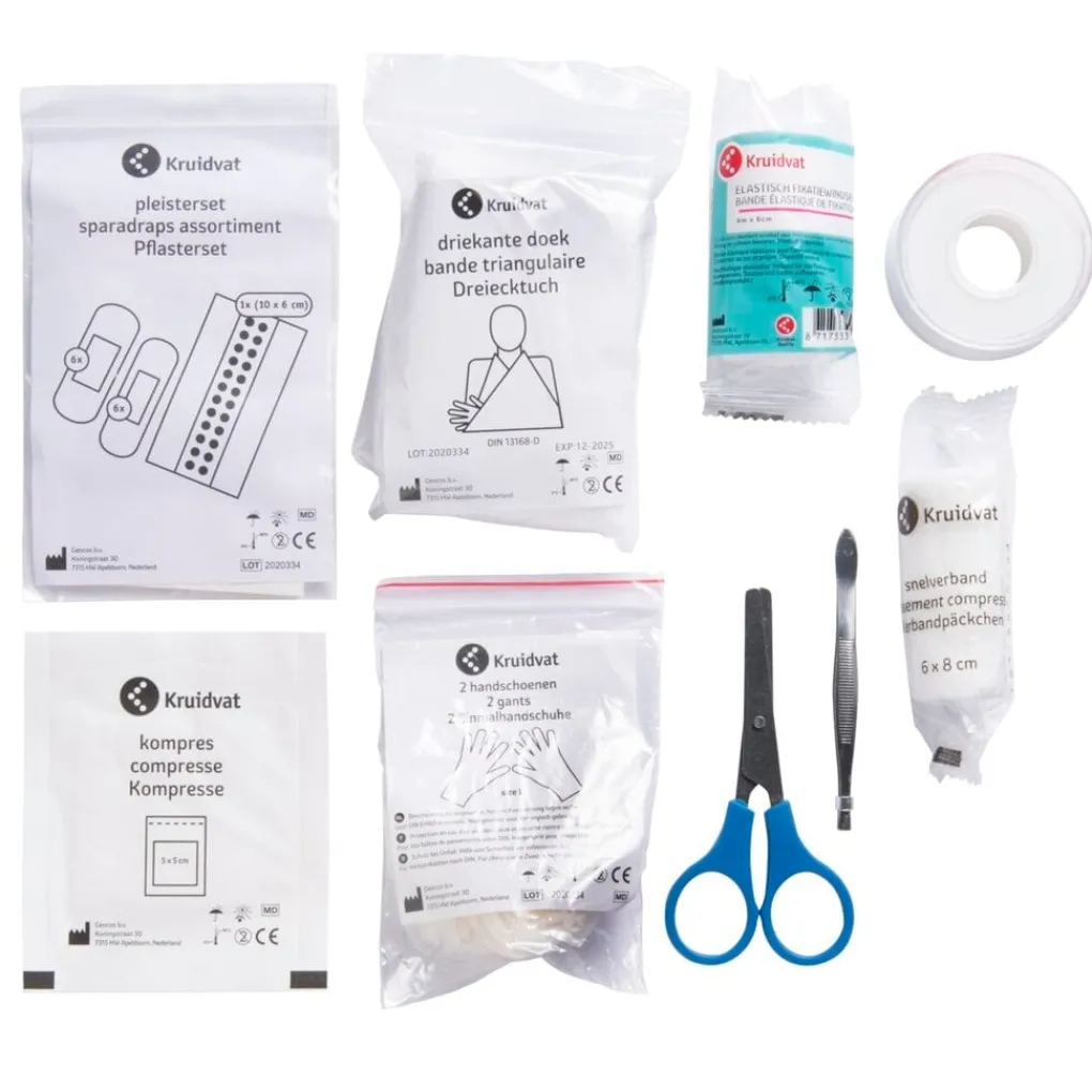 Dit praktische tasje biedt direct hulp bij de behandeling en verzorging van kleine ongelukken in en rondom je huis. De Kruidvat Eerste Hulp Set bevat onder andere verband, pleisters, een schaar, alcoholdoekjes en een EHBO-boekje.De Kruidvat Eerste Hulp Set bevat:• 1 snelverband (6×8 cm):• 2 elastische windsels (300×5 cm):• 3 hechtpleisters (500×1,25 cm):• 2 alcoholdoekjes:• 2 kompressen 1/16:• 1 paar vinyl handschoenen:• 1 pincet:• 1 verbandschaar:• 1 driekantendoek:• 6 PE pleisterstrips (19×72 mm):• 6 PE pleisterstrips (25×72 mm):• 1 TX wondpleister (6×10 cm):• 1 EHBO boekje.