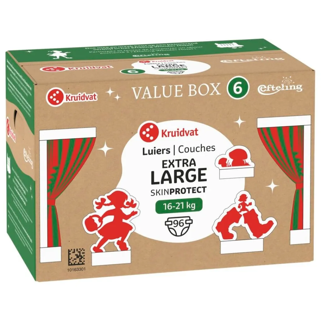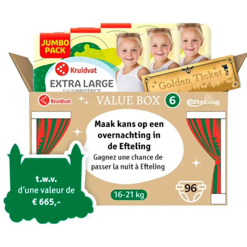 Beleef de magie van de Efteling met de Kruidvat Efteling Extra Large Maat 6 Luiers Valuebox. Vind het gouden ticket en maak kans op een betoverend verblijf in het Efteling Wonder Hotel, ter waarde van 665.00!