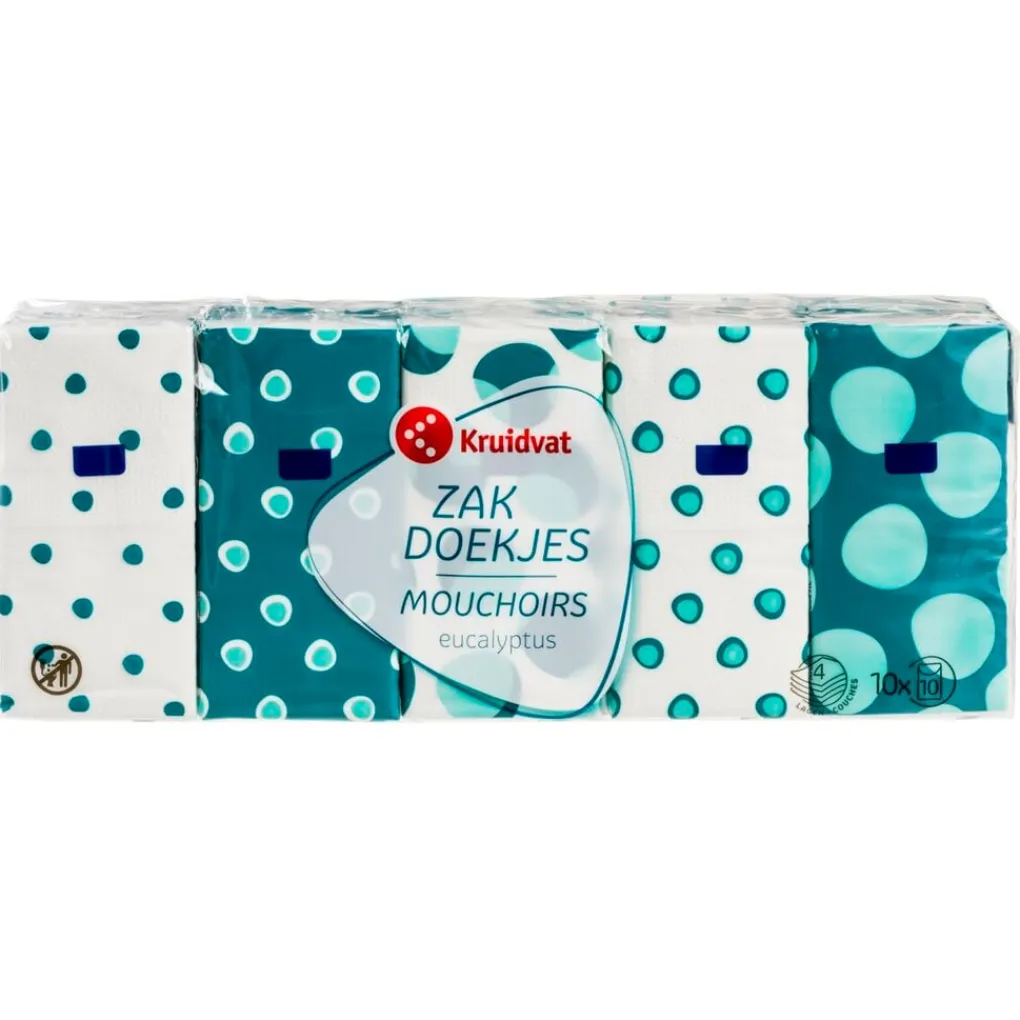 Voorkom een rode, schrale neus met deze Kruidvat Eucalyptus Zakdoekjes. De zakdoekjes zijn supersterk en hebben een heerlijke eucalyptusgeur.