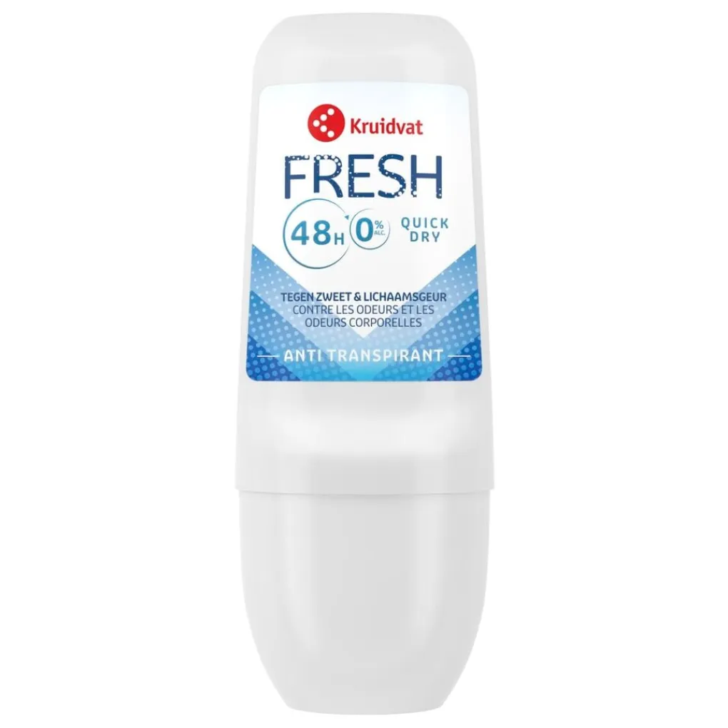 Kruidvat Fresh Antitranspirant Roller biedt 48 uur bescherming en bevat 0% alcohol. De roll-on voorkomt zweet en lichaamsgeur.
