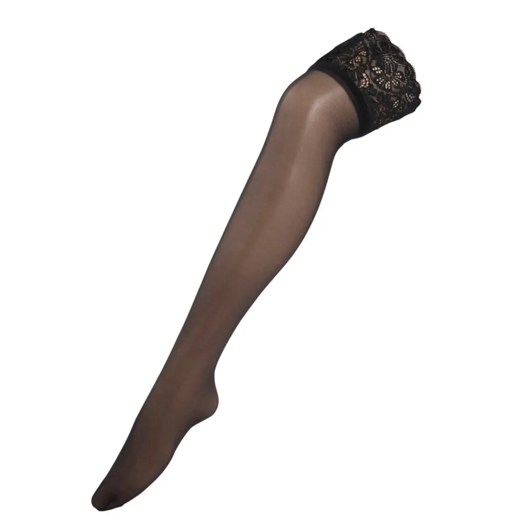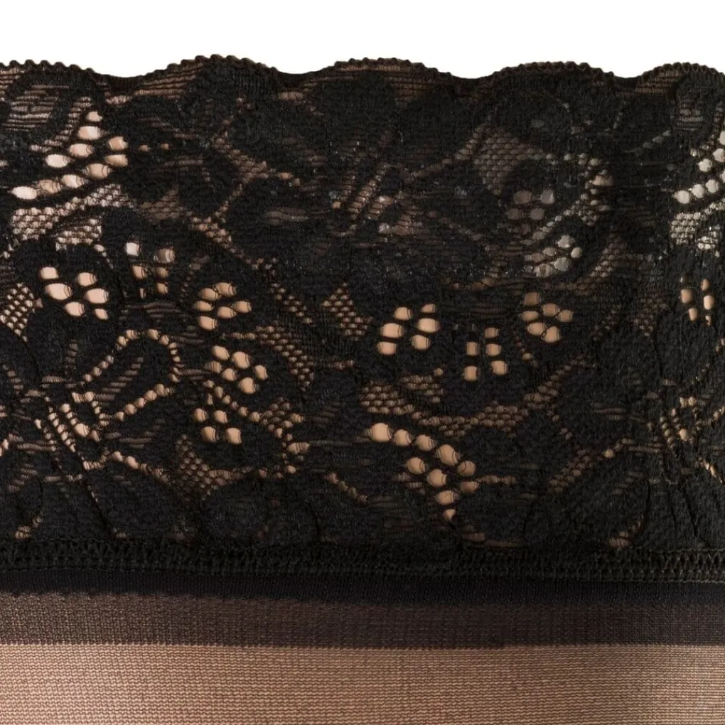 De Kruidvat Hold Ups Glans 15 Den Panty heeft een luxe brede zelfklevende kanten boord, zodat hij zonder jarretels te dragen is. De panty heeft een mooie zijdeglans en een versterkte teennaad met ladderstop.