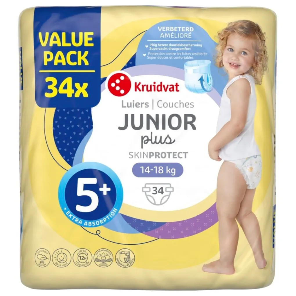 Wist je dat een op de twee baby’s in Nederland een luier draagt van Kruidvat?* Als je kiest voor Kruidvat Junior Plus Maat 5+ Luiers Valuepack kies je voor uitstekende kwaliteit en zachtheid, voor een Kruidvat-prijs.