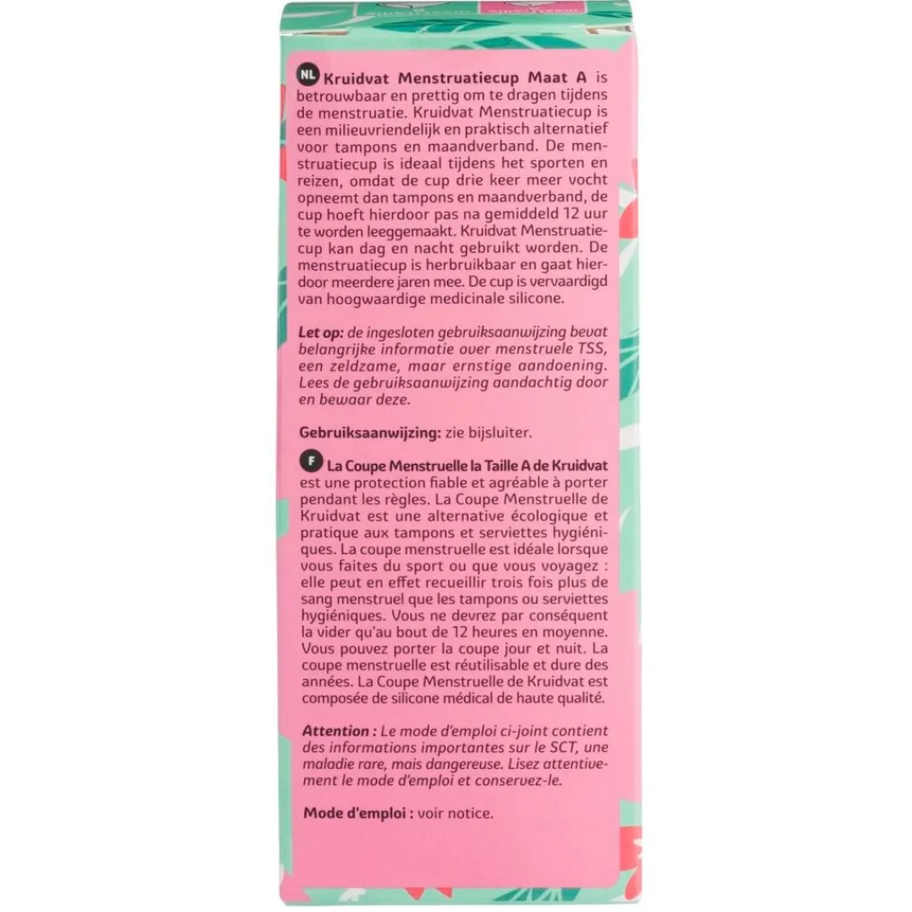 De Kruidvat Menstruatiecup is een milieuvriendelijk en praktisch alternatief voor een tampon of maandverband. De cup neemt tot drie keer meer op dan een tampon of maandverband en is daarom ideaal bij het sporten en reizen.