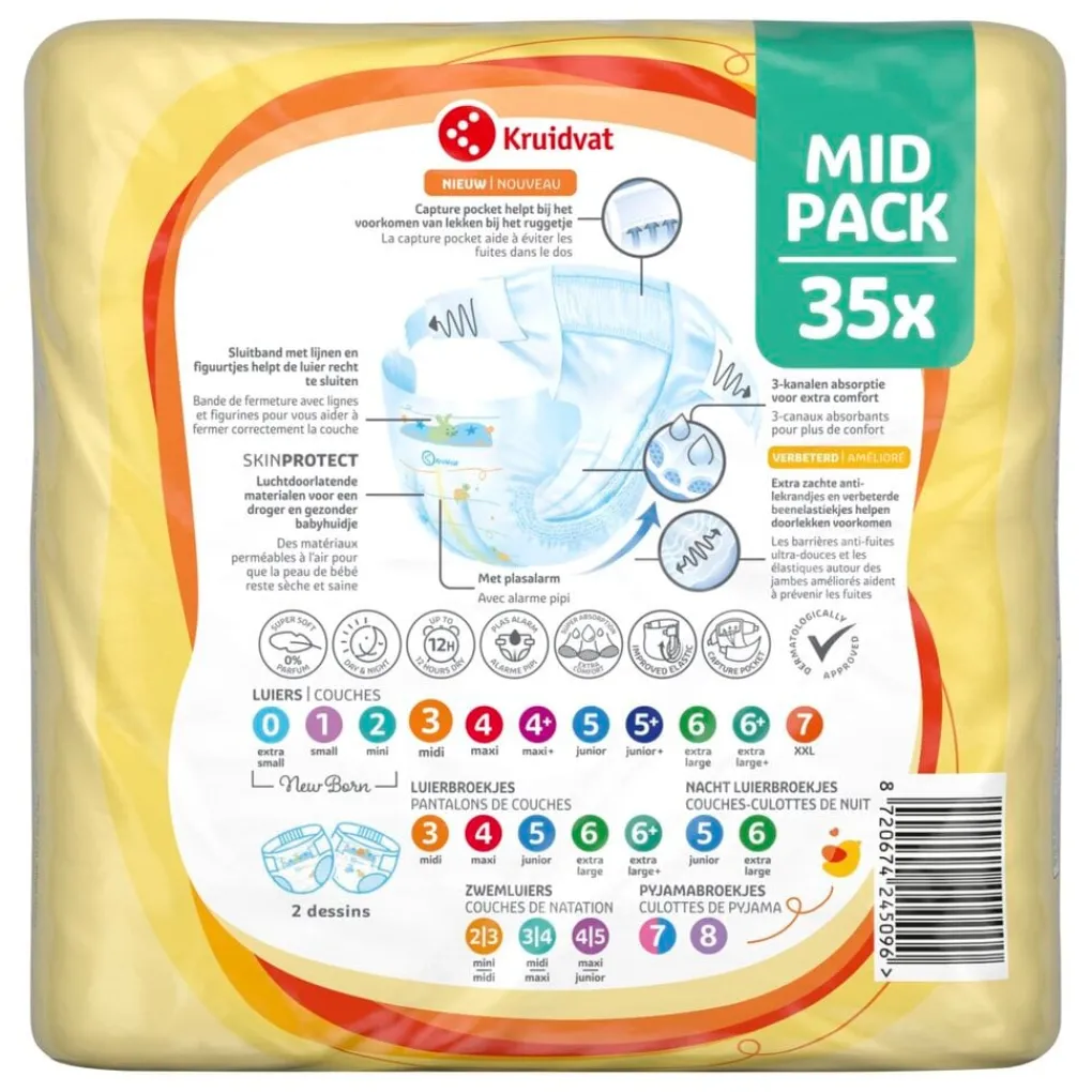 Wist je dat een op de twee baby’s in Nederland een luier draagt van Kruidvat?* Als je kiest voor Kruidvat Midi Maat 3 Luiers Midpack, kies je voor uitstekende kwaliteit en zachtheid, voor een Kruidvat prijs.