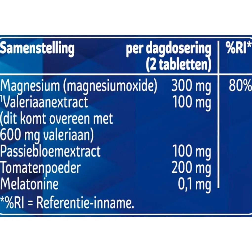 Ingrediënten: mineraal, vulstof (microkristallijne cellulose), valeriaanwortelextract (valeriana officinalis l.), passiebloemextract (passiflora incarnata l.), glansmiddelen (hydroxypropylmethylcellulose, magnesiumzouten van vetzuren, glycerol, talk, carnaubawas), melatonine.