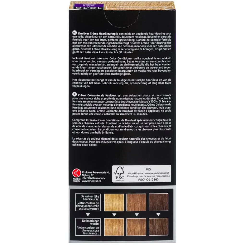 Het kleurresultaat hangt af van de huidige en natuurlijke haarkleur en van de conditie van je haar. Kruidvat Crème Haarkleuring is ontwikkeld en getest in samenwerking met kappers.
