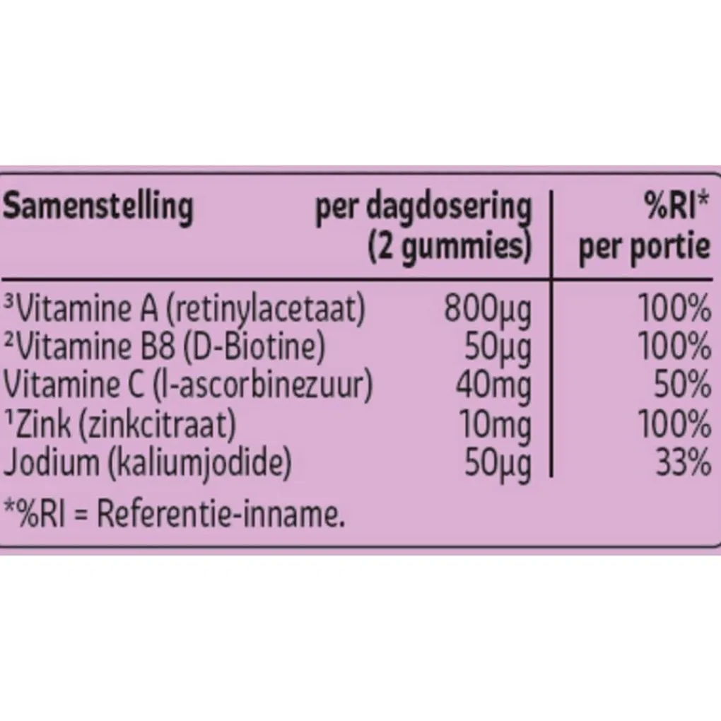 Samenstelling: Samenstelling ; per dagdosering (2 gummies) ; ; %RI* #