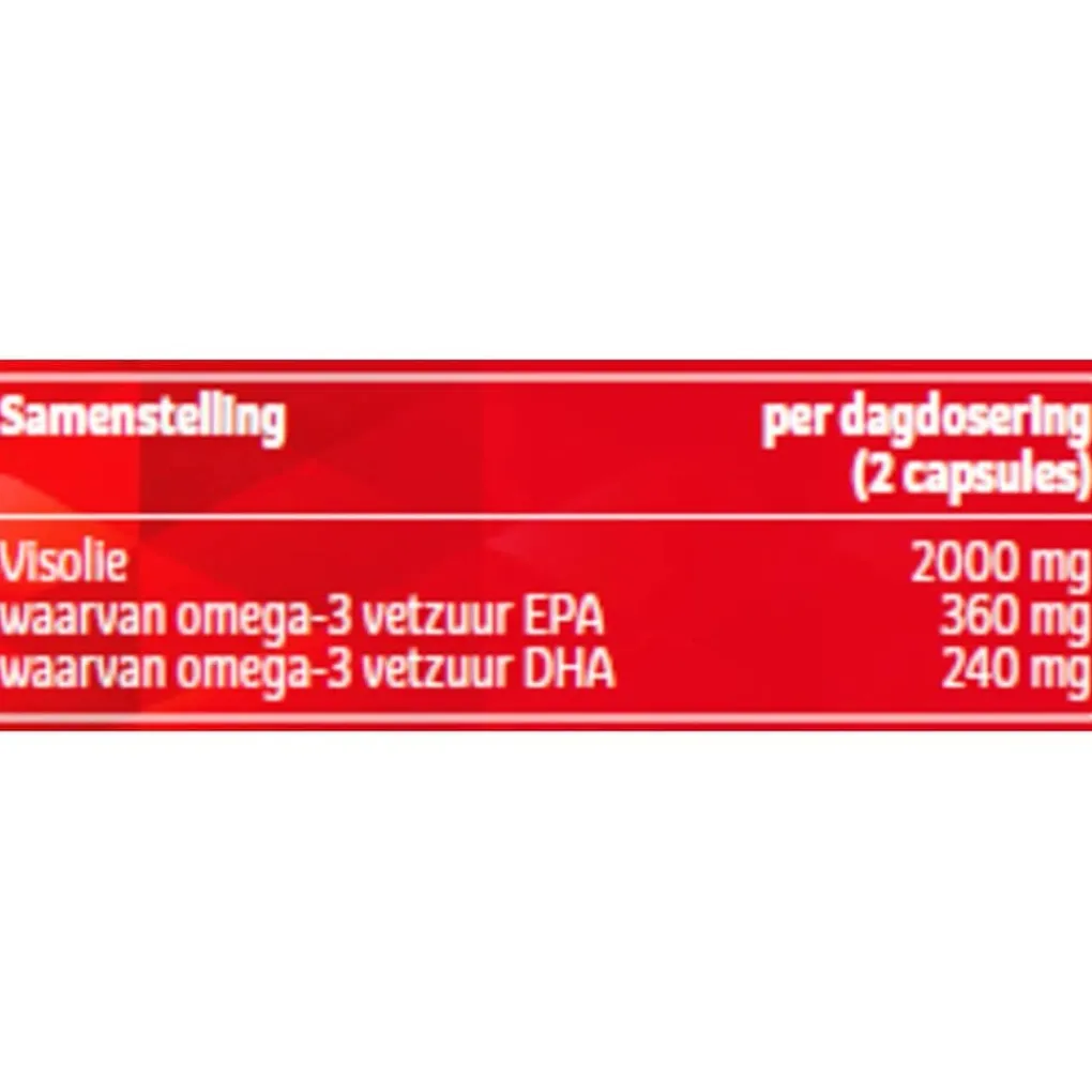 Kruidvat Omega-3 Visolie 1000 mg is rijk aan de vetzuren EPA en DHA.;Claimbeschrijving|EPA en DHA hebben een gunstige invloed op het hart. DHA is goed voor de hersenen. Ook is DHA goed voor het gezichtsvermogen. Het gunstige effect wordt verkregen bij een dagelijkse inname van minimaal 250 mg EPA en DHA (hart) of 250 mg DHA (hersenen en gezichtsvermogen).