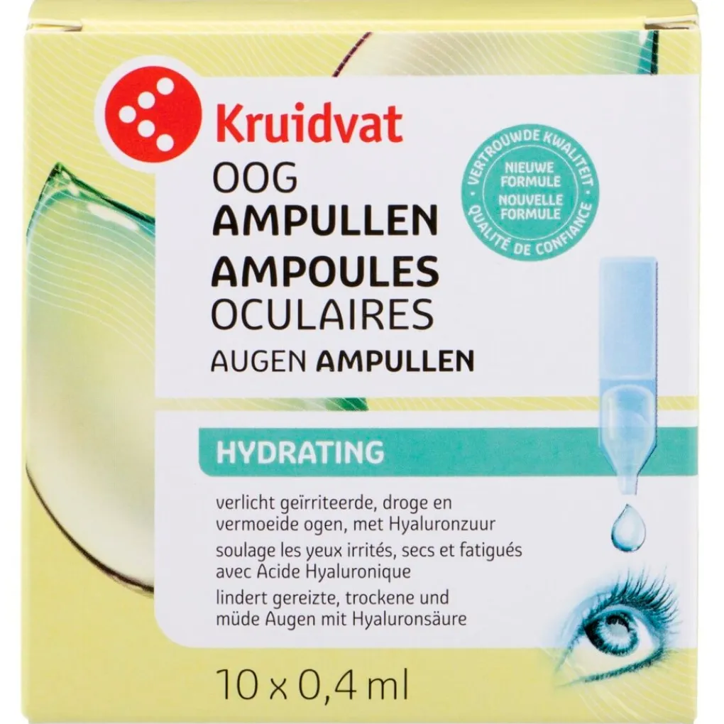 De Kruidvat Oogampullen bevatten hyaluronzuur en verlichten geïrriteerde, droge en vermoeide ogen. In de verpakking zitten tien stuks van 0,4 ml.