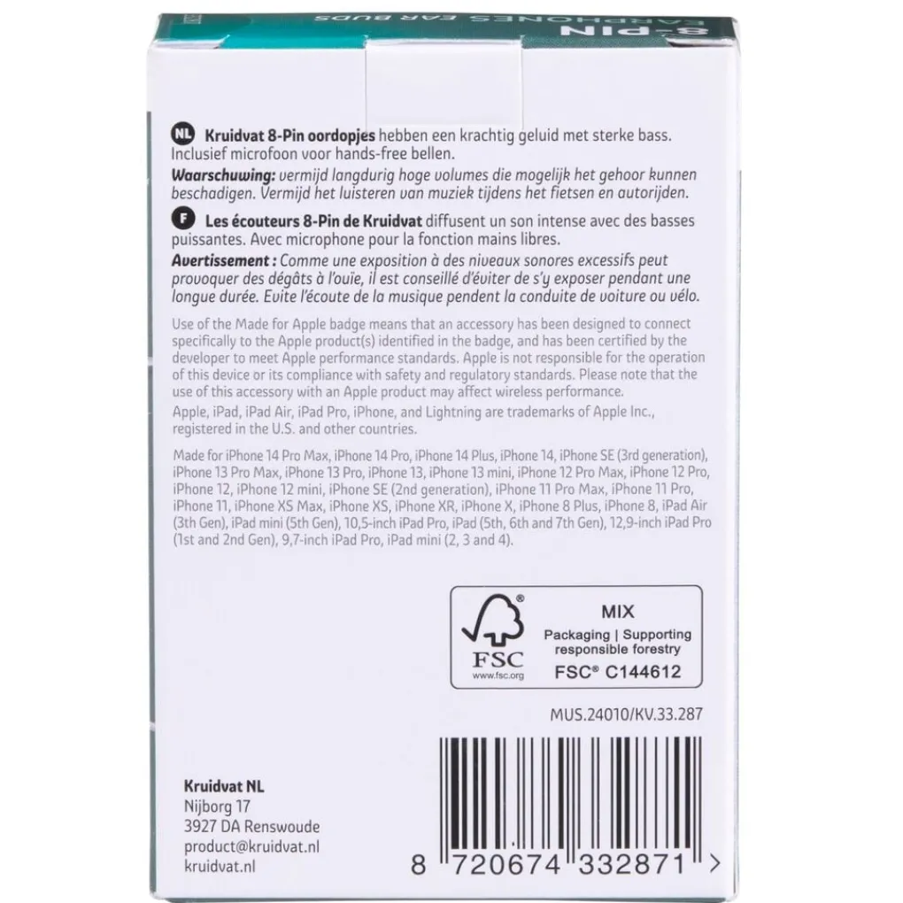 Kruidvat Oordopjes zijn geschikt voor alle apparaten met een 8-pin ingang. De oordopjes hebben een krachtig geluid, sterke bass, afstandsbediening voor volumeregeling en een microfoon voor het voeren van hands-free gesprekken.