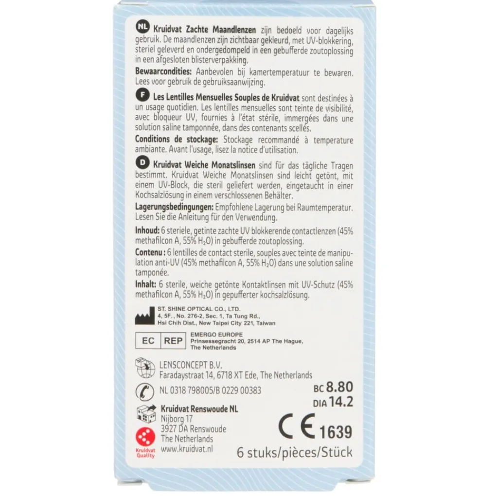 Kruidvat zachte maandlenzen zijn bedoeld voor dagelijks gebruik. De maandlenzen zijn zichtbaar gekleurd, met UV-blokkering, steriel geleverd en ondergedompeld in een gebufferde zoutoplossing in een afgesloten blisterverpakking.