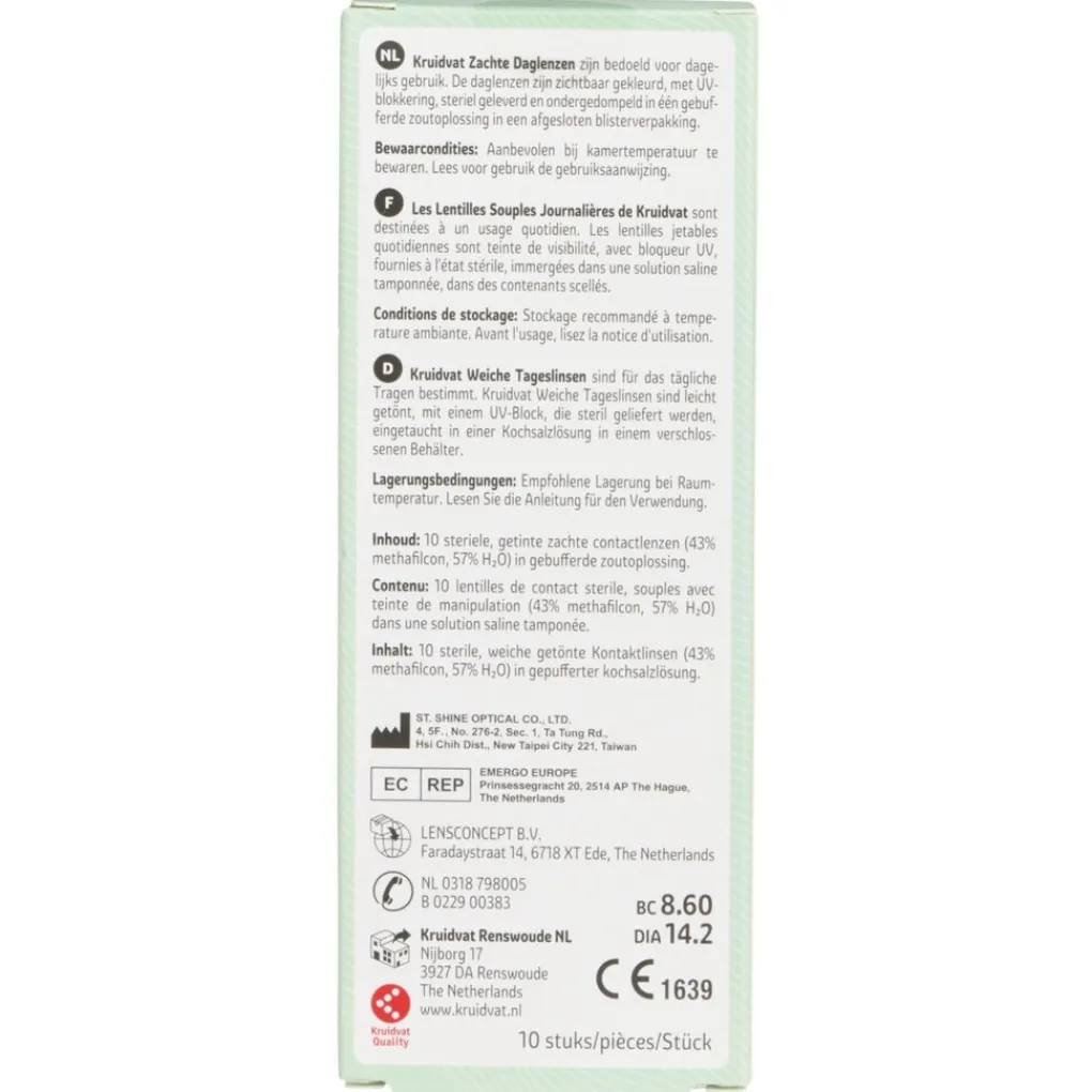 Kruidvat zachte daglenzen zijn bedoeld voor dagelijks gebruik. De daglenzen zijn zichtbaar gekleurd, met UV-blokkering, steriel geleverd en ondergedompeld in één gebufferde zoutoplossing in een afgesloten blisterverpakking.