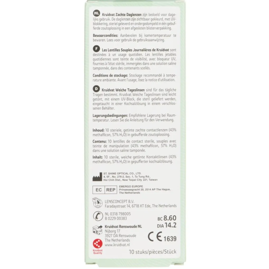Kruidvat zachte daglenzen zijn bedoeld voor dagelijks gebruik. De daglenzen zijn zichtbaar gekleurd, met UV-blokkering, steriel geleverd en ondergedompeld in één gebufferde zoutoplossing in een afgesloten blisterverpakking.