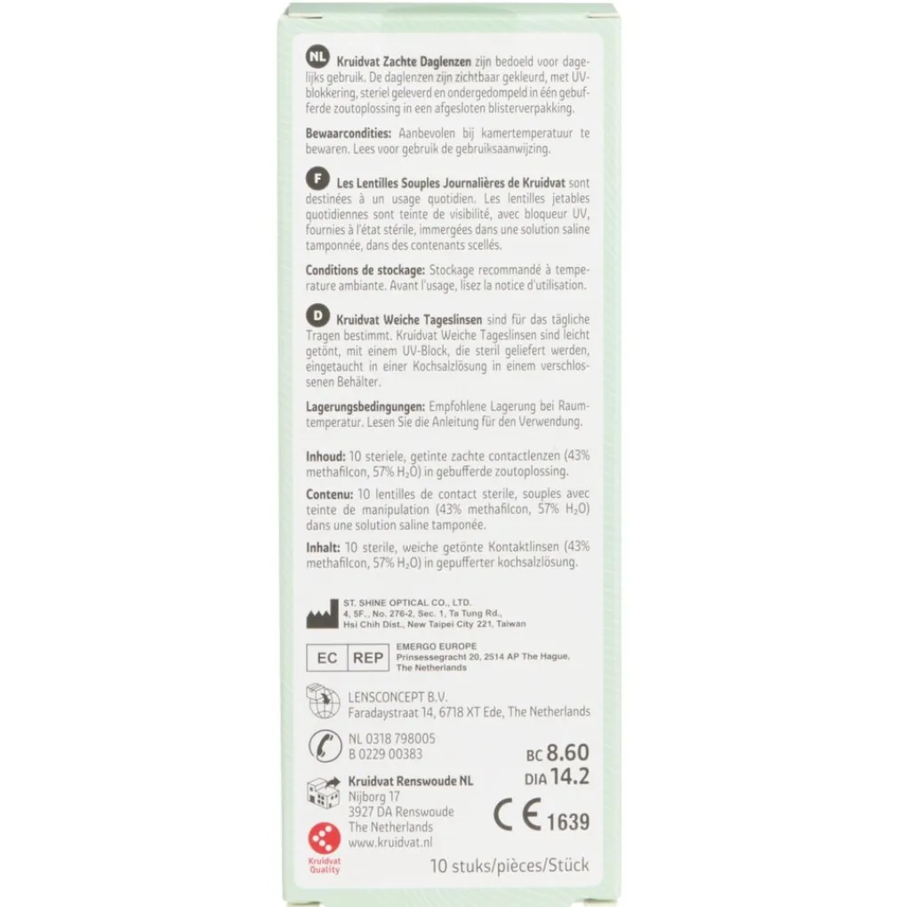 Kruidvat zachte daglenzen zijn bedoeld voor dagelijks gebruik. De daglenzen zijn zichtbaar gekleurd, met UV-blokkering, steriel geleverd en ondergedompeld in één gebufferde zoutoplossing in een afgesloten blisterverpakking.