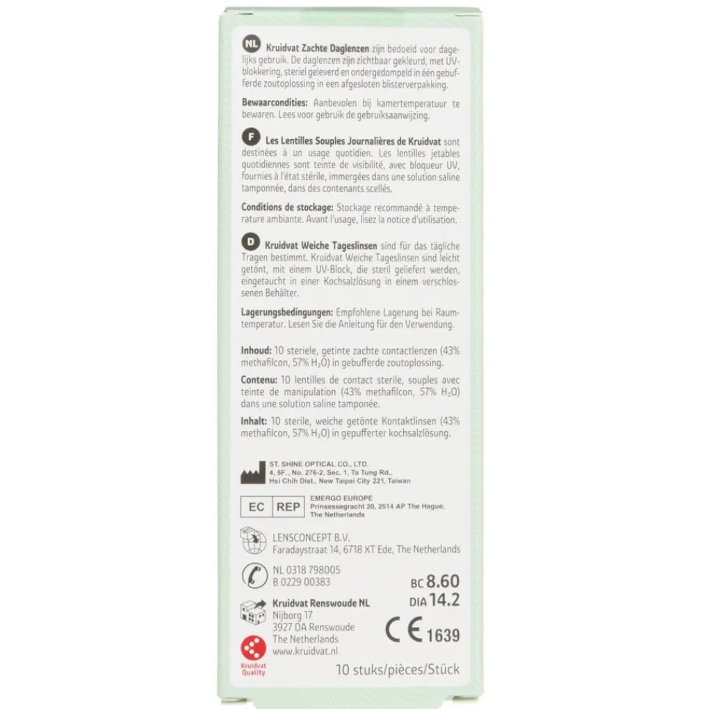 Kruidvat zachte daglenzen zijn bedoeld voor dagelijks gebruik. De daglenzen zijn zichtbaar gekleurd, met UV-blokkering, steriel geleverd en ondergedompeld in één gebufferde zoutoplossing in een afgesloten blisterverpakking.
