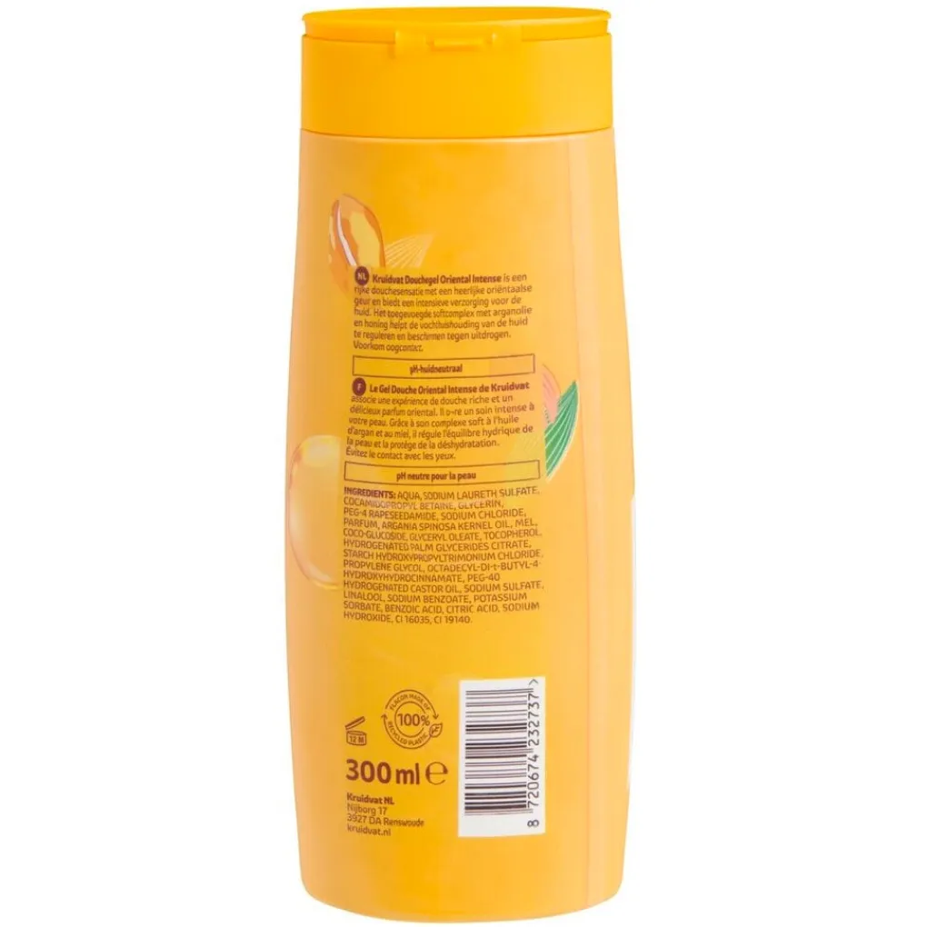 Kruidvat Oriental Intense Douchegel is pH-huidneutraal en is dermatologisch getest. Vermijd contact met je ogen.