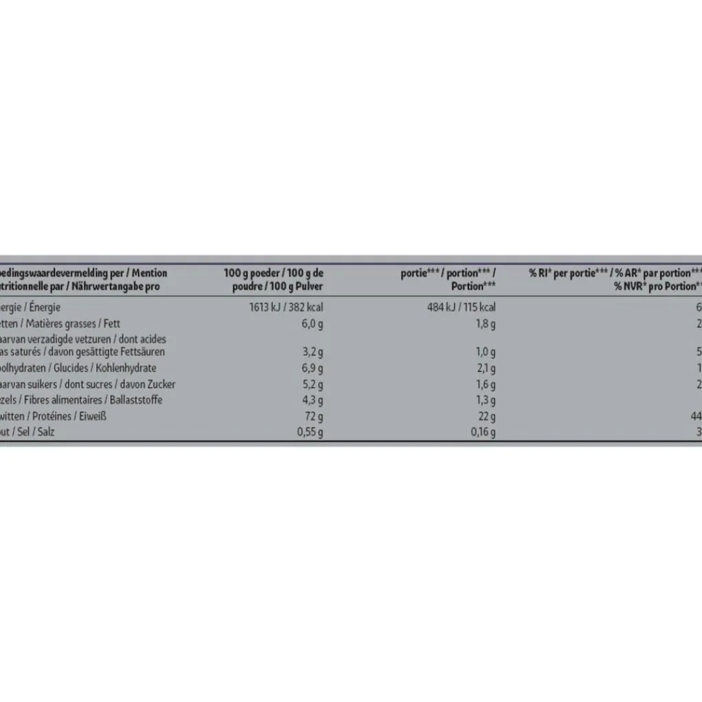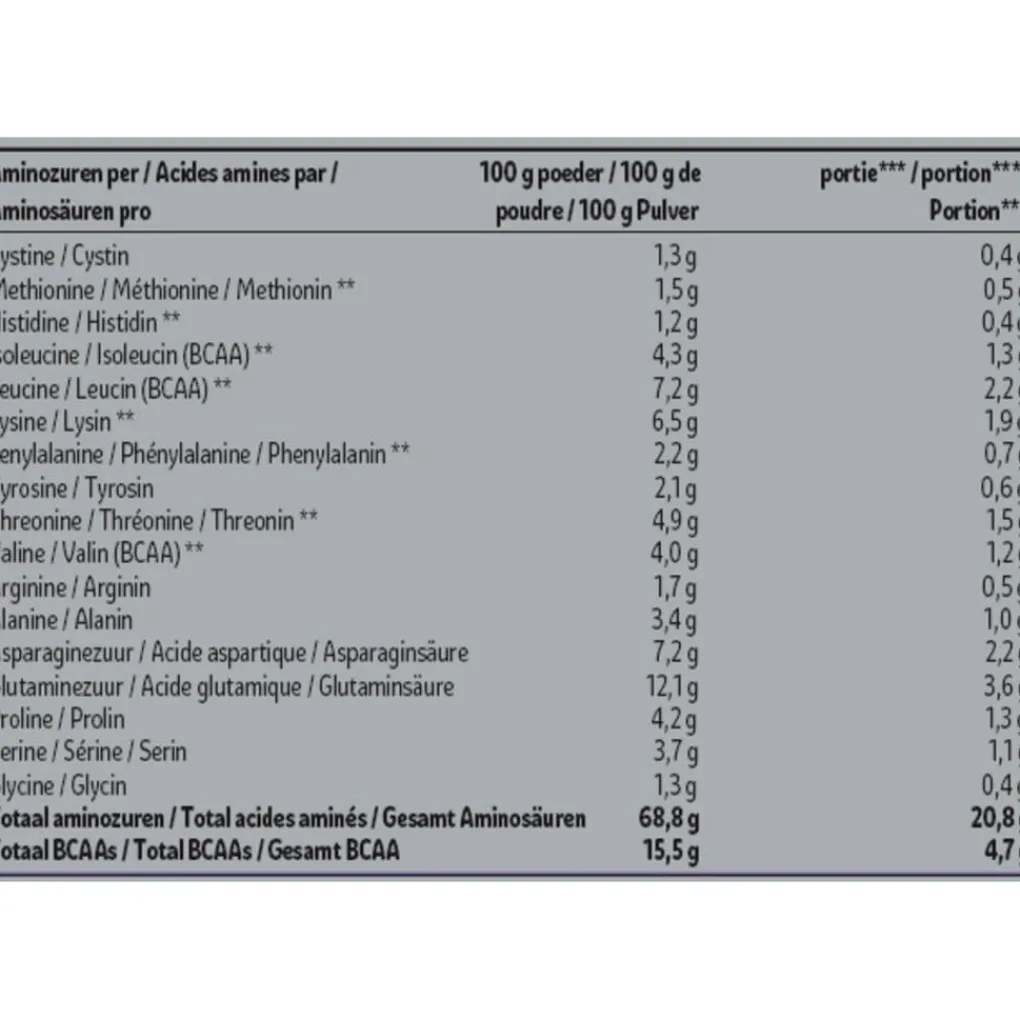 Samenstelling:# Voedingswaardevermelding per;100 g poeder; ; ;portie***; ; ;%RI*per portie***# Energie;1613 kJ /;382 kcal;484 kJ/;115 kcal;6%# Vetten;6,0;g;1,8;g;2%# waarvan verzadigde vetzuren;3,2;g;1,0;g;5%# Koolhydraten;6,9;g;2,1;g;1%# waarvan suikers;5,2;g;1,6;g;2%# Vezels;4,3;g;1,3;g;-# Eiwitten;72;g;22;g;44%# Zout;0,55;g;0,16;g;3%# * RI = Referentie-innamevan een gemiddelde volwassene(8400 kJ/2000 kcal).# *** Een portie is 30 g +250 ml water.# Aminozuren per;100 g poeder;; ;portie***; ; # Cystine;1,3;g;0,4;g# Methionine**;1,5;g;0,5;g# Histidine**;1,2;g;0,4;g# Isoleucine(BCAA)**;4,3;g;1,3;g# Leucine(BCAA)**;7,2;g;2,2;g# Lysine**;6,5;g;1,9;g# Fenylalanine**;2,2;g;0,7;g# Tyrosine;2,1;g;0,6;g# Threonine**;4,9;g;1,5;g# Valine (BCAA)**;4,0;g;1,2;g# Arginine;1,7;g;0,5;g# Alanine;3,4;g;1,0;g# Asparaginezuur;7,2;g;2,2;g# Glutaminezuur;12,1;g;3,6;g# Proline;4,2;g;1,3;g# Serine;3,7;g;1,1;g# Glycine;1,3;g;0,4;g# Totaal aminozuren;68,8;g;20,8;g# Totaal BCAAs;15,5;g;4,7;g