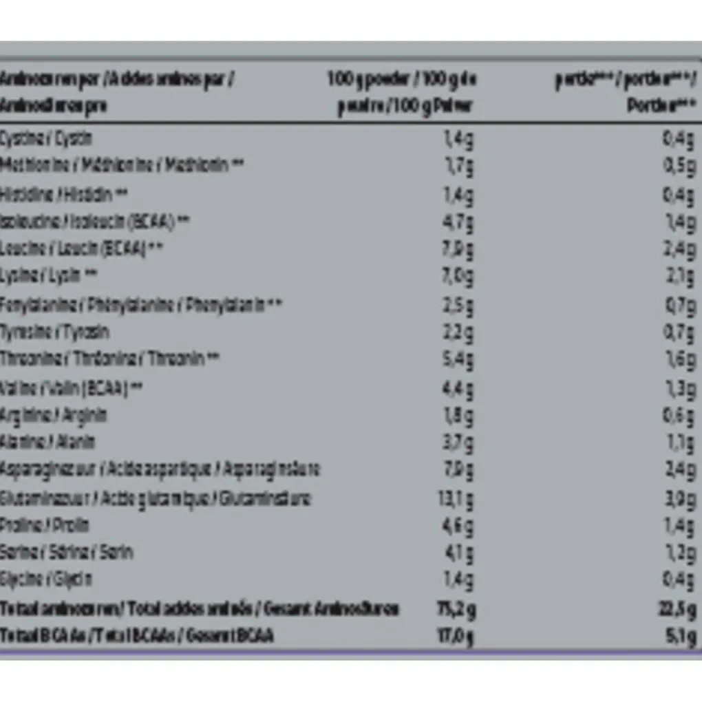 Voedingswaardevermelding per;100 g poeder;; ;portie***; ; ;%RI*per portie***# Energie;1611kJ / 381 kcal;483 kJ / 114 kcal;6%# Vetten;5,5g;1,7;g;2%# waarvan verzadigde vetzuren;2,9;g;0,9;g;5%#Koolhydraten;6,7;g;2,0;g;1%# waarvan suikers;5,8;g;1,7;g;2%# Vezels;1,7;g;0,5;g;-#Eiwitten;75;g;23;g;45%#Zout;0,59;g;0,18;g;3%# * RI = Referentie-inname van een gemiddelde volwassene(8400 kJ/2000 kcal).# *** Een portie is 30 g +250 ml water.# Aminozuren per;100 g poeder;; ;portie***; ; # Cystine;1,4g;0,4g#Methionine**;1,7g;0,5g# Histidine**;1,4g;0,4g#Isoleucine (BCAA)**;4,7g;1,4g# Leucine(BCAA)**;7,9g;2,4g# Lysine**;7,0g;2,1g#Fenylalanine**;2,5g;0,7g# Tyrosine;2,2g;0,7g#Threonine**;5,4g;1,6g# Valine(BCAA)**;4,4g;1,3g# Arginine;1,8g;0,6g#Alanine;3,7g;1,1g#Asparaginezuur;7,9g;2,4g#Glutaminezuur;13,1g;3,9g# Proline;4,6g;1,4g#Serine;4,1g;1,2g# Glycine;1,4g;0,4g# Totaalaminozuren;75,2g;22,5g# TotalBCAAs;17,0g;5,1g