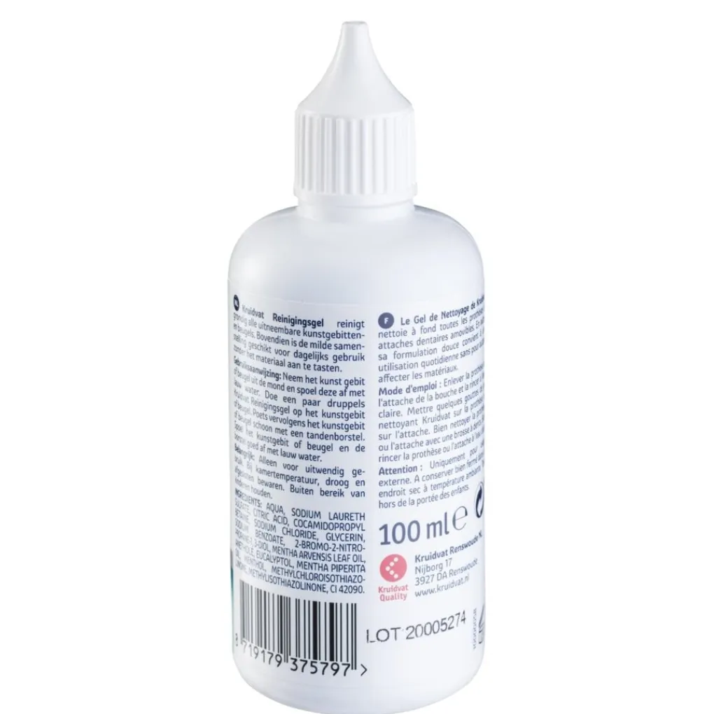 Neem het kunst gebit of beugel uit de mond en spoel deze af met lauw water. Doe een paar druppels Kruidvat Reinigingsgel op het kunstgebit of beugel. Poets vervolgens het kunstgebit of beugel schoon met een tandenborstel. Spoel het kunstgebit of beugel en de borstel goed af met lauw water. Alleen voor uitwendig gebruik.