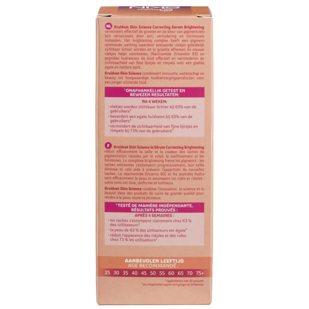 Het Kruidvat Skin Science Brightening Correcting Serum vermindert effectief de grootte en kleur van pigmentvlekken veroorzaakt door zon, veroudering en hormonale invloeden.