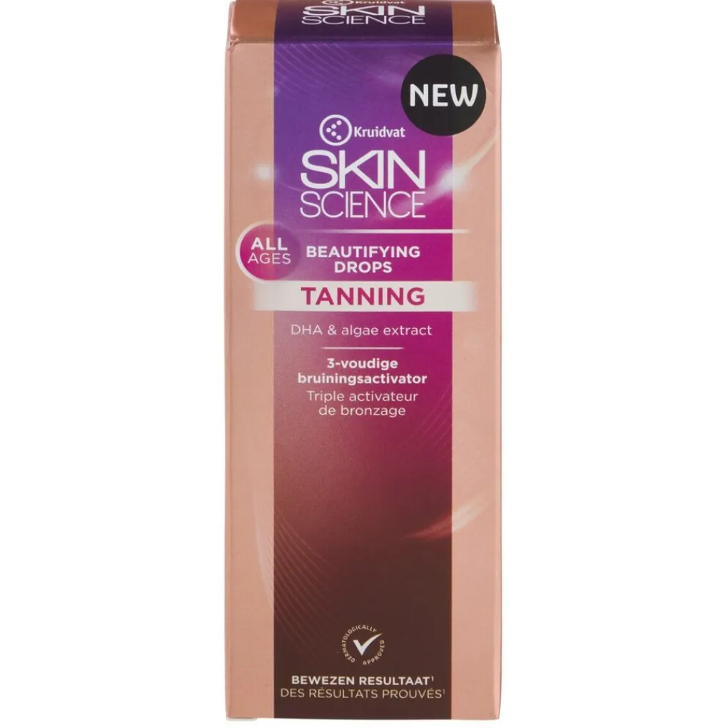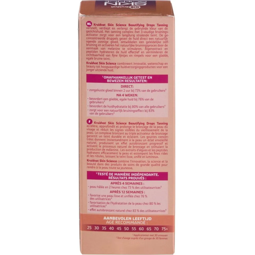 Let op: Kruidvat Skin Science Tanning Beautifying Drops bieden geen bescherming tegen schadelijke uv-stralen. Vermijd contact met je ogen en textiel.