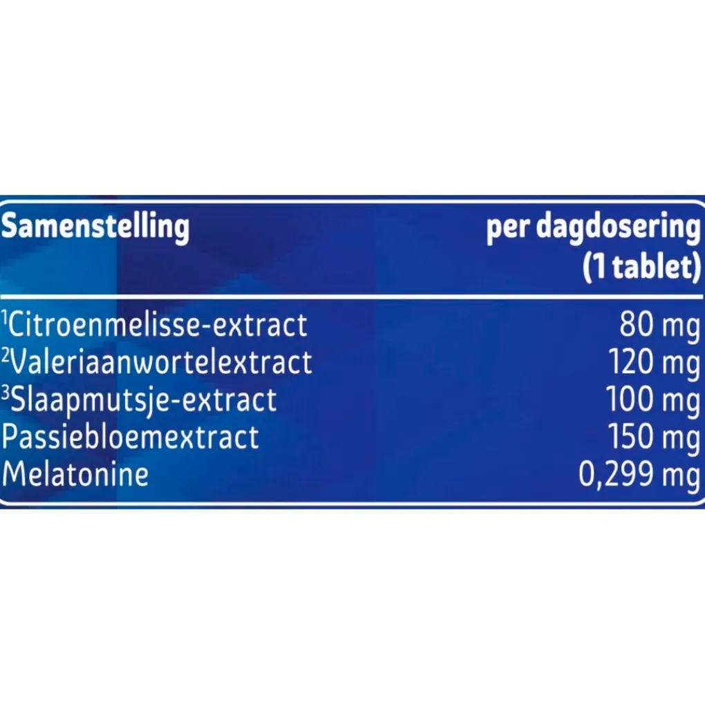 Ingrediënten: passiebloemextract (passiflora incarnata L.), valeriaanwortelextract (valeriana officinalis l.), vulstof (microkristallijne cellulose), slaapmutsje-extract (eschscholzia californica cham.), citroenmelisse-extract (melissa officinalis L.), maïszetmeel, glansmiddelen (hydroxypropylmethylcellulose, magnesiumzouten van vetzuren, glycerol, talk, carnaubawas), melatonine.