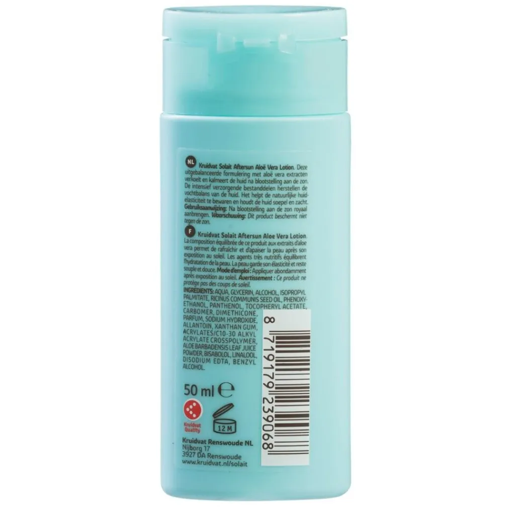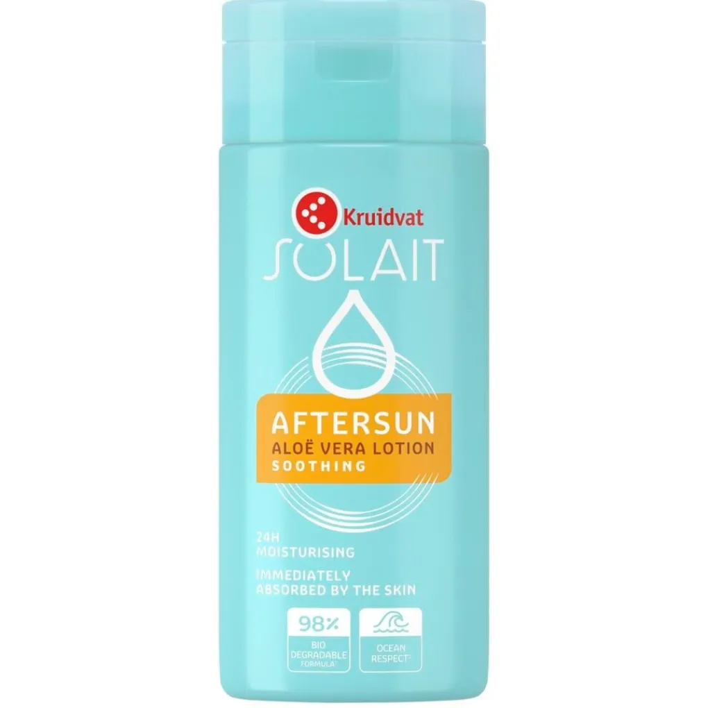 Verzorg je huid na het zonnen met de verkoelende en kalmerende Kruidvat Solait Aloë Vera Mini Aftersun Lotion. De aftersun wordt na het aanbrengen direct door je huid opgenomen en heeft een intensief vochtinbrengende werking.