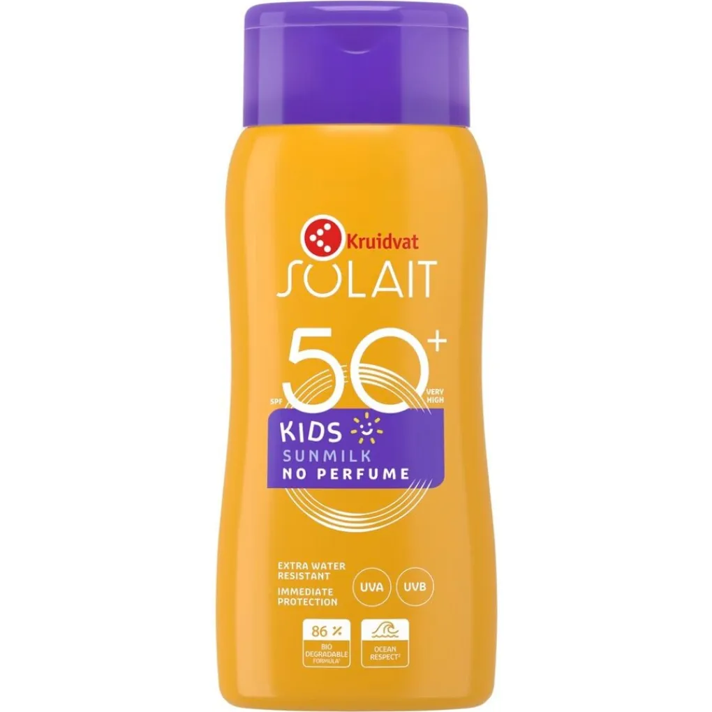 Geef de huid van je kindje een hoge bescherming tegen de zon met de ongeparfumeerde Kruidvat Solait Kids SPF50+ Sunmilk. De combinatie van uv A- en B-filters zorgt voor directe bescherming.