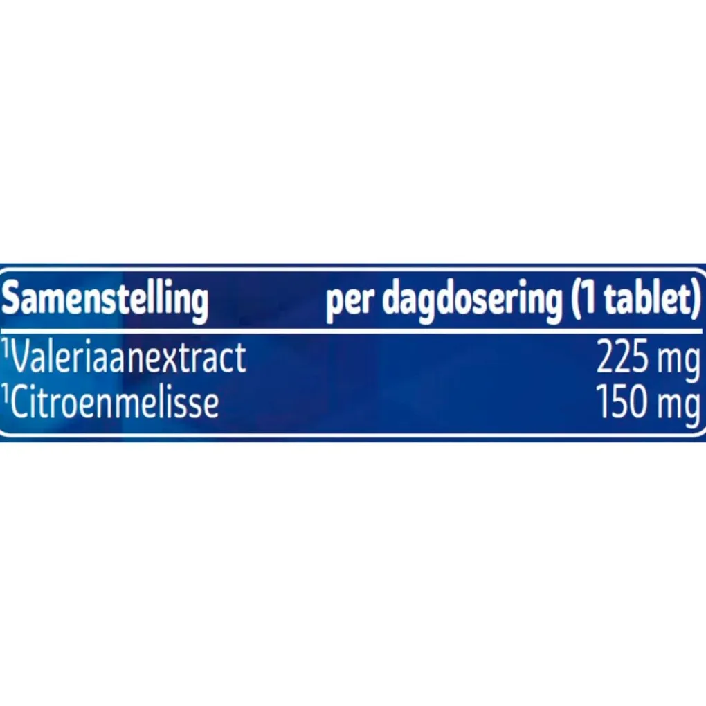Ingrediënten: vulstoffen (calciumcarbonaat, microkristallijne cellulose), valeriaanextract (valeriana officinalis), citroenmelisse (melissa officinalis), antiklontermiddelen (vetzuren, magnesiumzouten van vetzuren), stabilisatoren (natrium carboxymethylcellulose, siliciumdioxide), glansmiddelen (hydroxypropylmethylcellulose, glycerol, talk, carnaubawas).