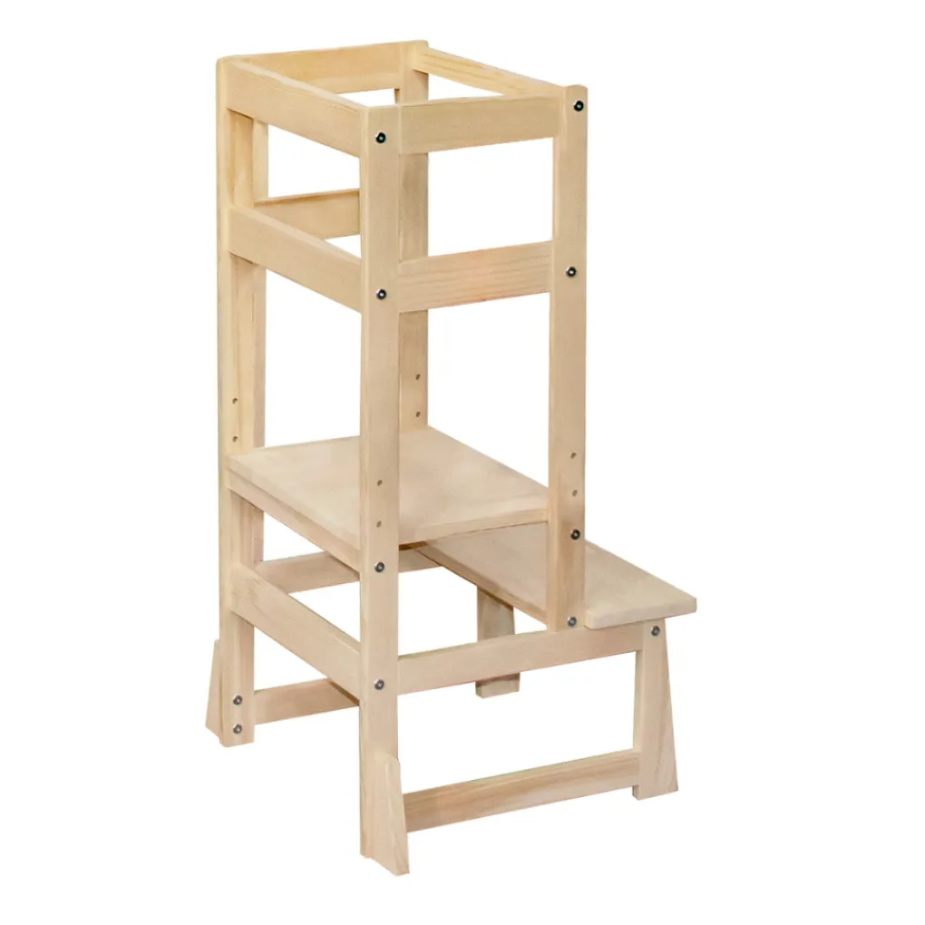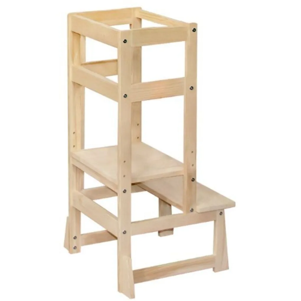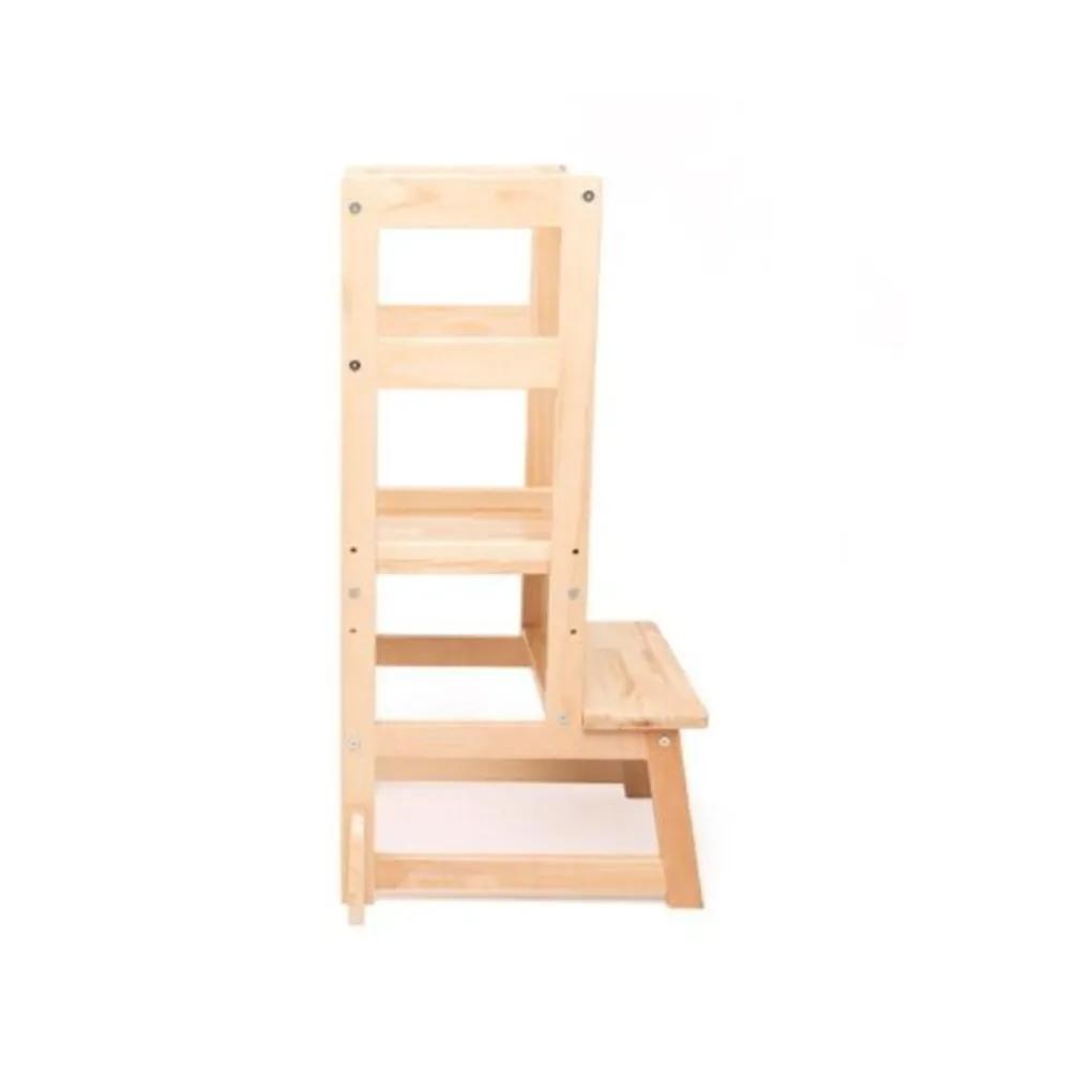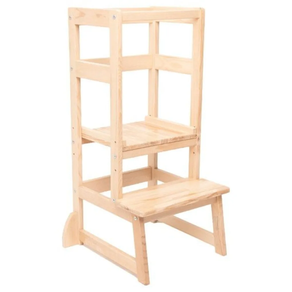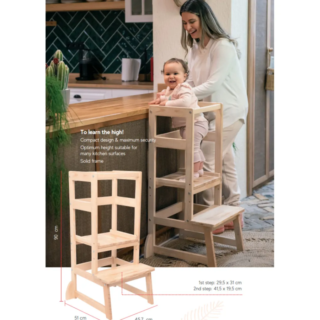 Je kleintje klimt makkelijk op het krukje en staat veilig op tussen de leuningen. Het tweede treetje van het krukje is te verstellen in 3 verschillende hoogtes. Door de leuningen en het anti-slip oppervlak staat je kleintje veel veiliger dan op een ‘normaal’ krukje of opstapje. Daarnaast zijn de pootjes voorzien van extra versteviging waardoor de toren erg stabiel staat. Vanuit hier kan hij of zij nieuwe activiteiten ontdekken en praktische vaardigheden opdoen. Dit ontdekken en het zelfstandig ontwikkelen van deze vaardigheden geeft je kleine een boost in zelfvertrouwen. Geschikt voor kindjes vanaf 18 maanden.