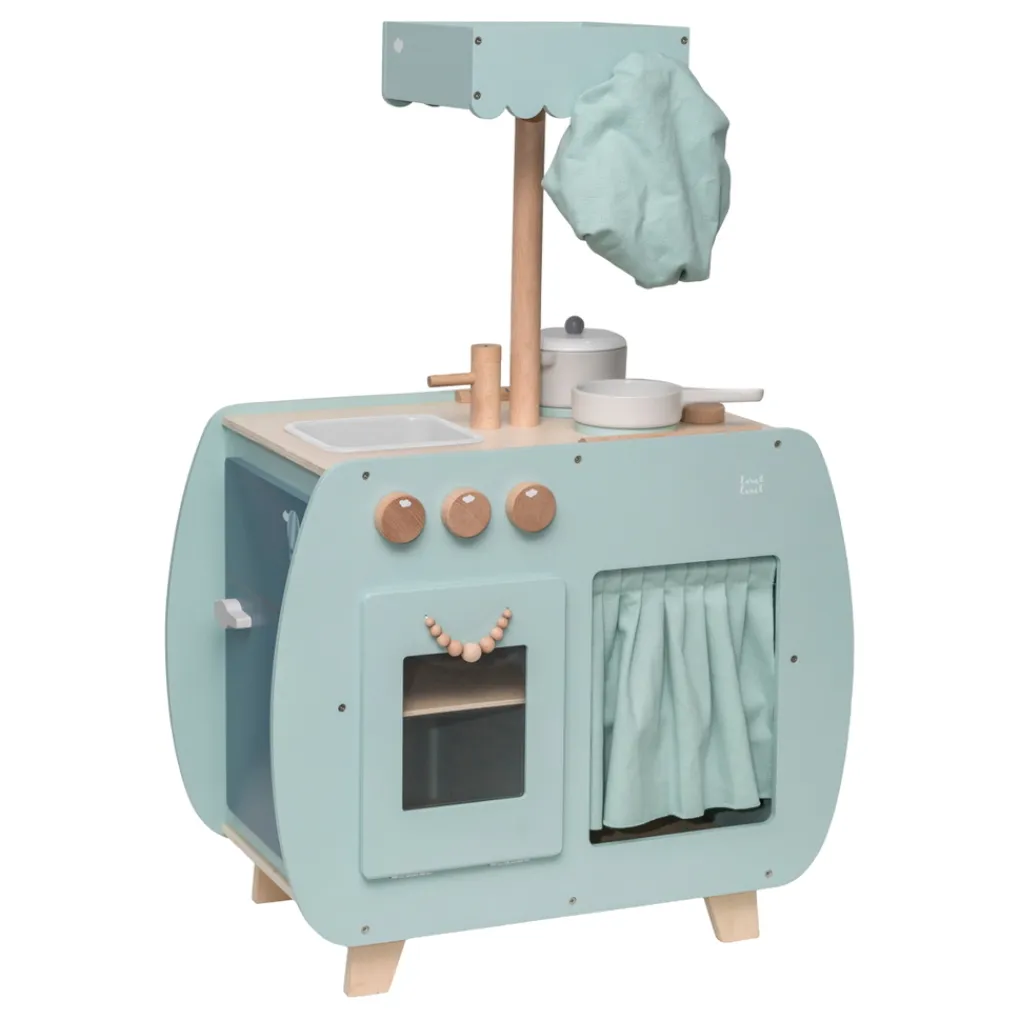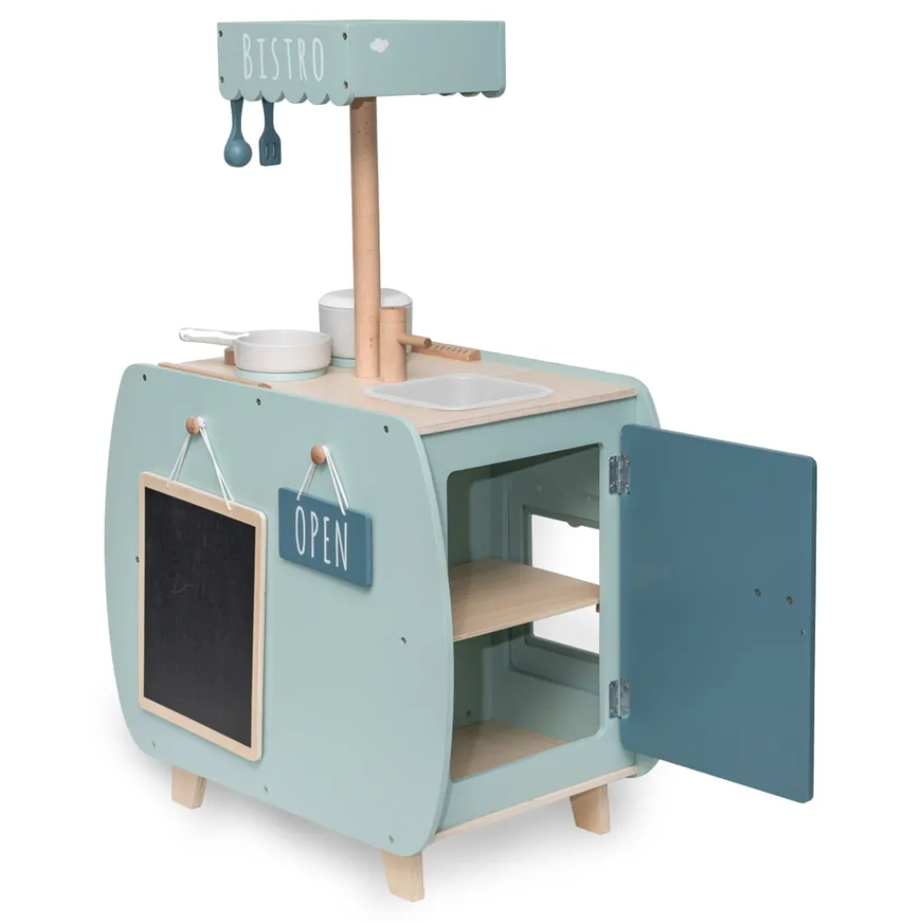 Doordat het kookeiland is voorzien van verschillende schattige details zoals de knoppen van het gasfornuis en de leuke handvaten, lijkt het net een echte grote mensen keuken. Daarnaast kunnen ook alle deurtjes geopend worden. Omdat je kindje rond om de keuken kan lopen, kan hij of zij ook samen met een vriendje of vriendinnetje de sterren van de hemel koken. De keuken heeft aan alle kanten wat te beleven en heeft de afmetingen 60 x 34,5 x 51/89 cm. De totale hoogte van de keuken is 89 cm, de hoogte van het werkblad is 51 cm hoog. Het bistro keukentje is geschikt voor kinderen vanaf 3 jaar.
