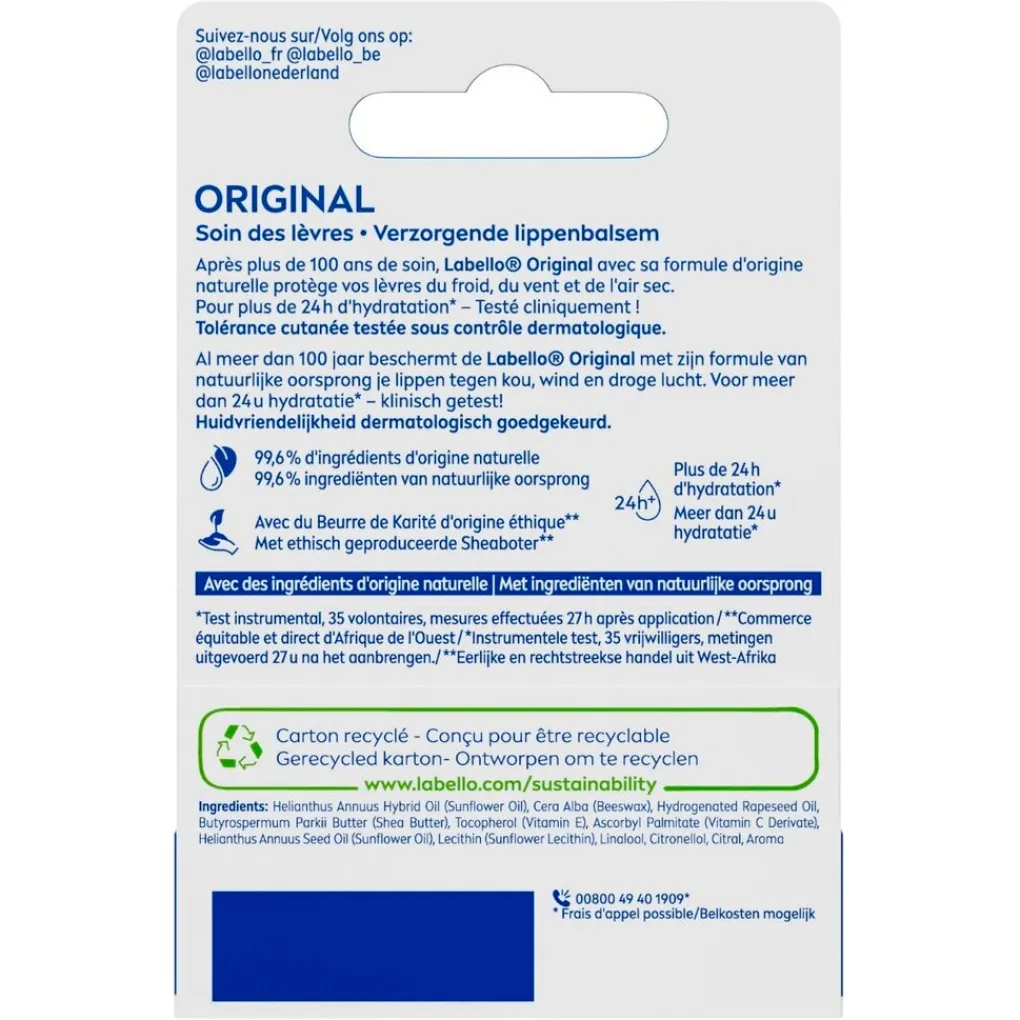 Voed en verwen je lippen langdurig met Labello Original Lippenbalsem. De formule met Hydra IQ en sheaboter geeft je lippen een ultieme hydratatie en beschermt ze effectief tegen uitdrogen.