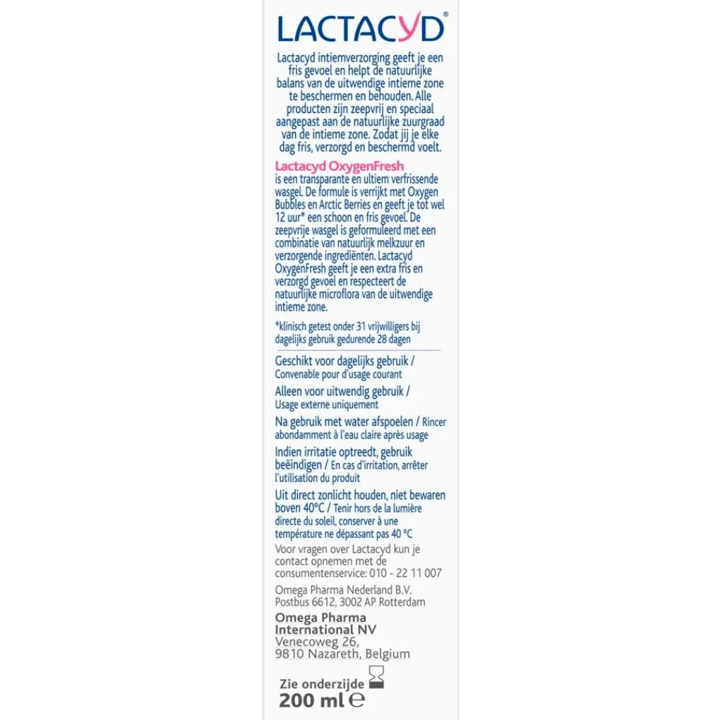 Lactacyd Oxyen Fresh Wasgel is een zeepvrije wasgel die verrijkt is met O-oxygen Bubbles en Arctic Berries. De zeepvrije wasgel biedt tot wel 12* uur lang een schoon en fris gevoel. De wasgel bevat een combinatie van verzorgende ingrediënten en natuurlijk melkzuur. Lactacyd Oxyen Fresh Wasgel respecteert de natuurlijke microflora van de uitwendige intieme zone en biedt een extra fris en schoon gevoel.