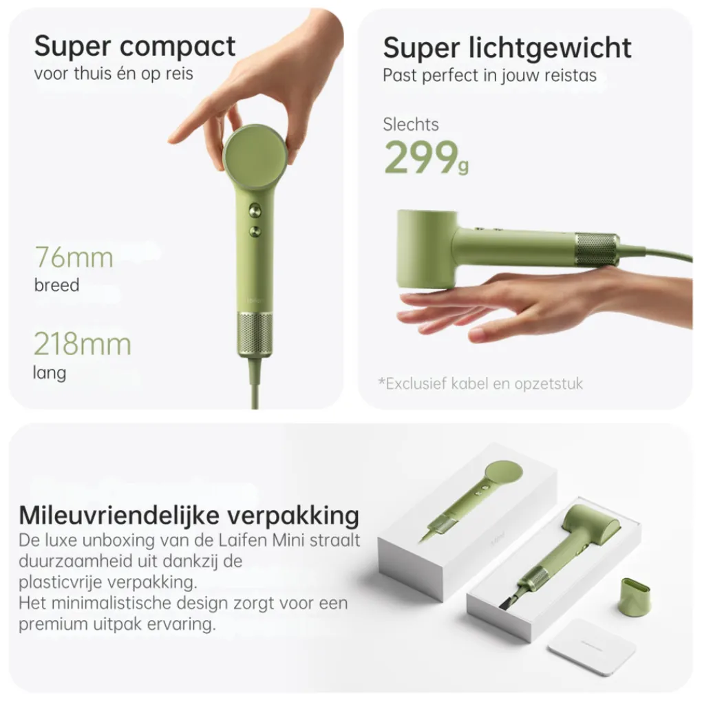 De Laifen Mini is misschien wel kleiner dan andere Laifen haardrogers, maar is voorzien van dezelfde soorten krachtige technologie. Het ergonomische design zorgt ervoor dat de föhn goed in de hand ligt. De geluiddempende technologie zorgt er daarnaast voor dat er slechts 61dB geluid wordt geproduceerd tijdens het drogen van je haar.